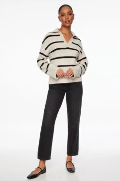 Dynamite V-Neck Polo Sweater In Oatmeal Mix Stripe