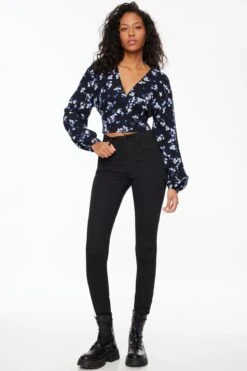 Dynamite Sheer Balloon Sleeve Blouse In Navy & Cream Abstract