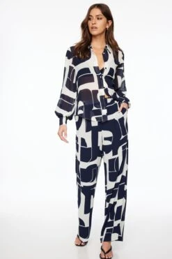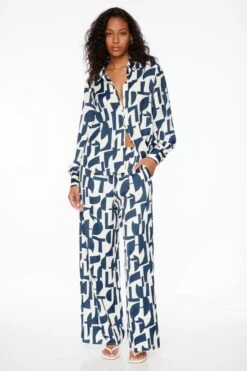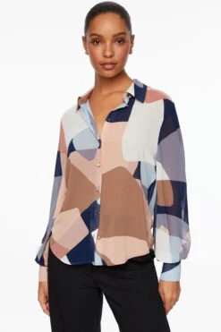 Dynamite Nellie Balloon Sleeve Button Up Shirt In Blue Geometric