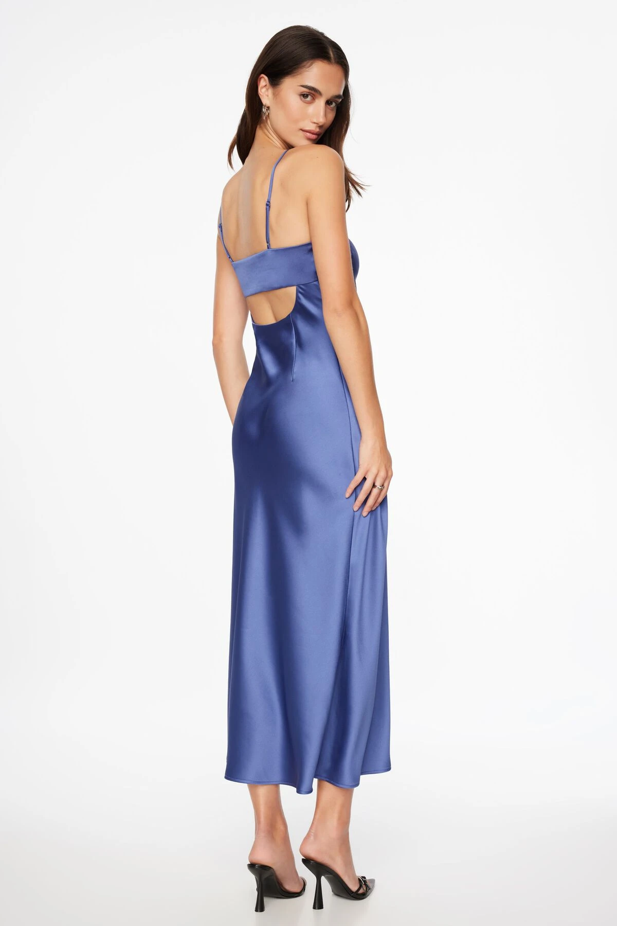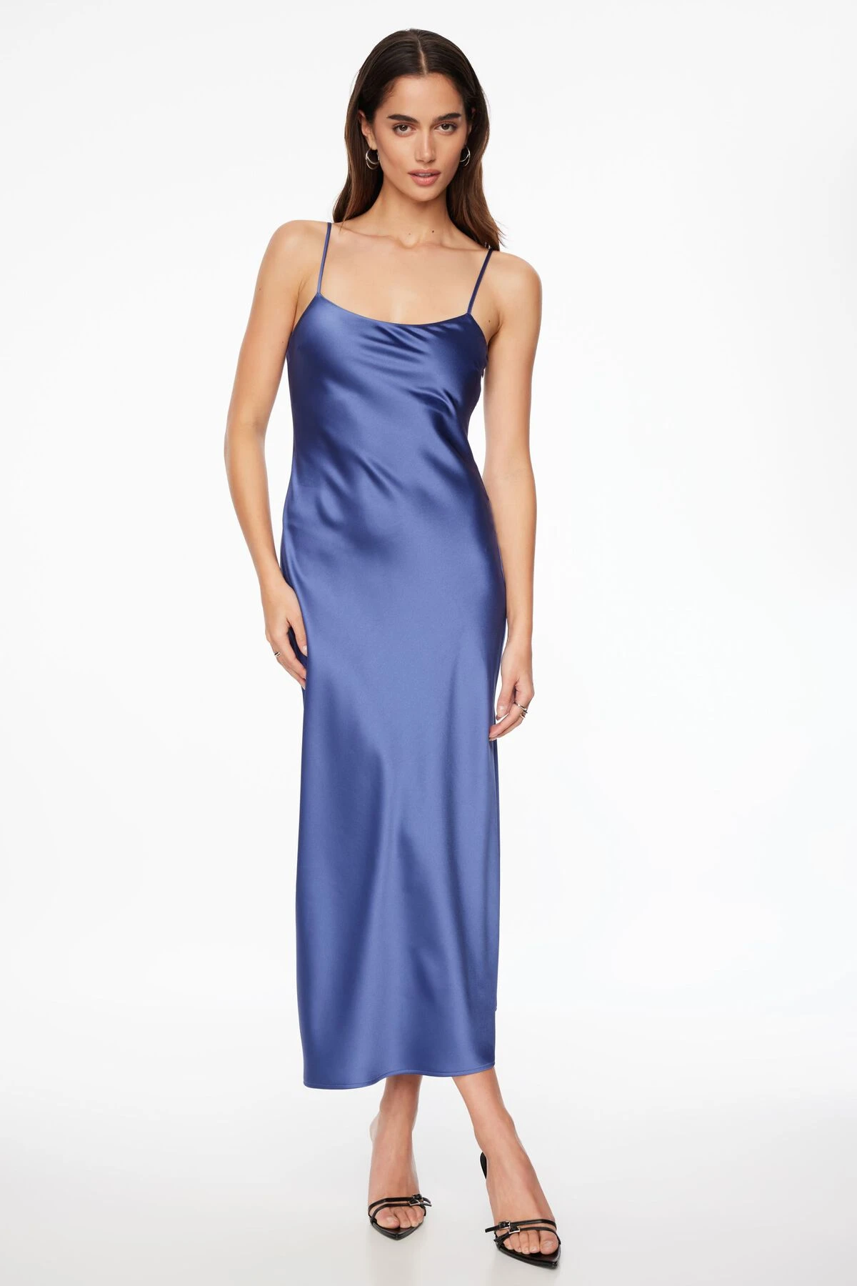 This is a satin scoop neck slip midi dress – Designed with an open back and relaxed fit.