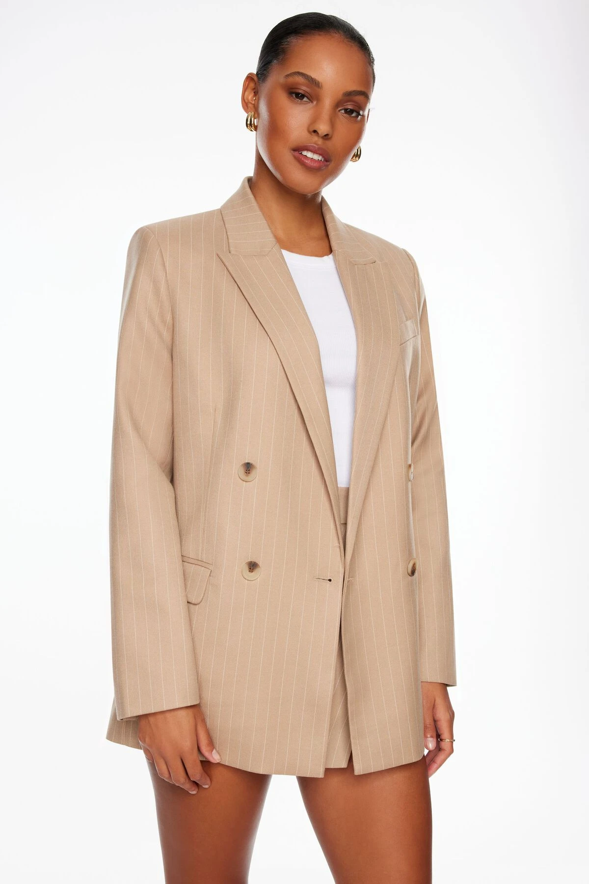 This is a tailored double-breasted blazer. Designed to be an oversized fit.