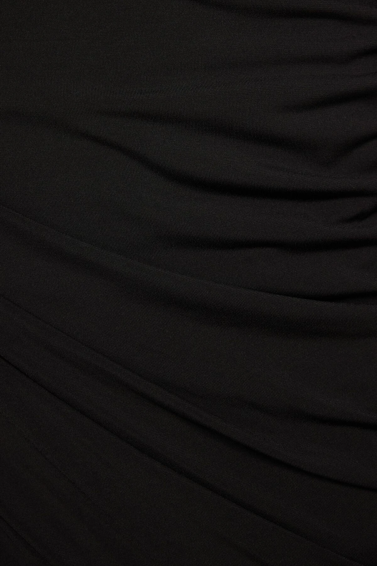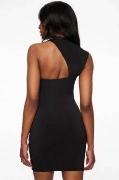 This is an asymmetrical detailed mini dress that contours and shapes your body. Made with a soft and ultra-stretchy fabric.
