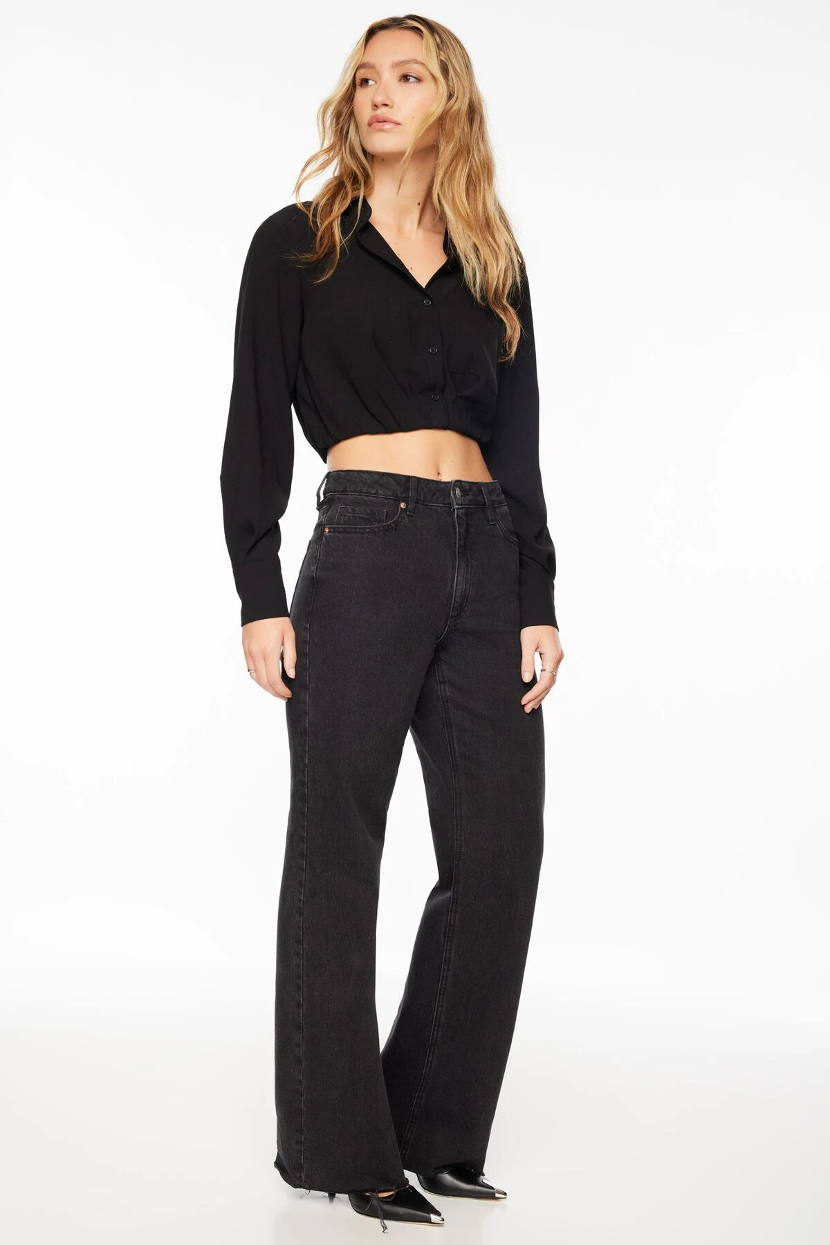 This is a cropped long sleeve button up shirt – Designed with an elasticated waist to create a cinched silhouette.