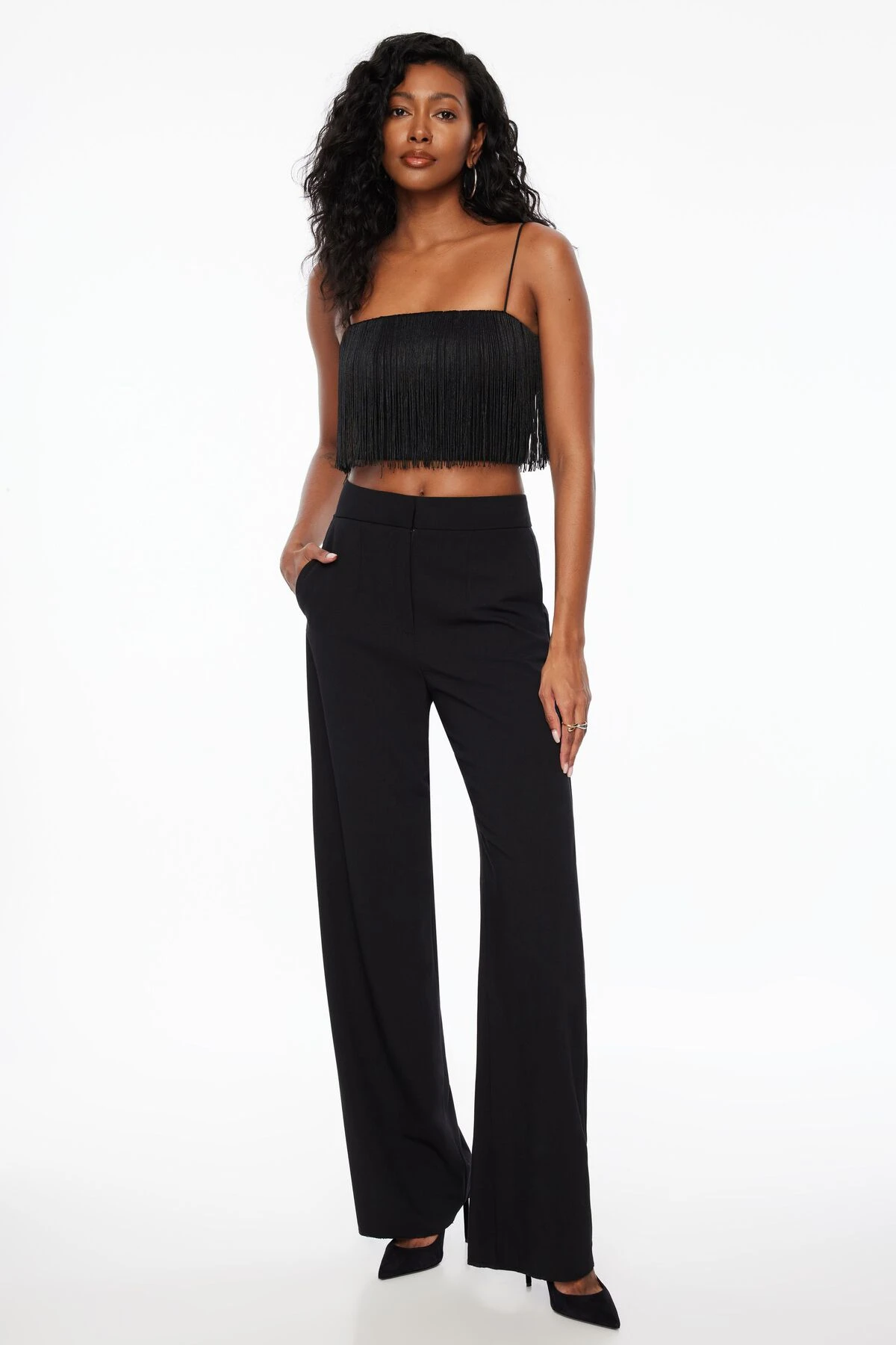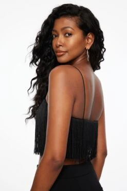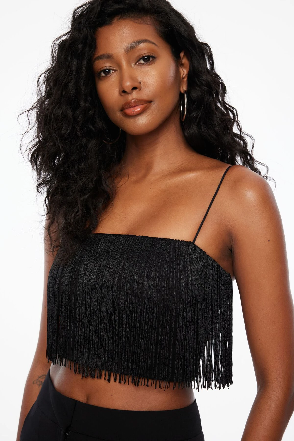 Make a statement with this crepe square neck crop top – Designed with fringe detailing and stretch fitted to your form.