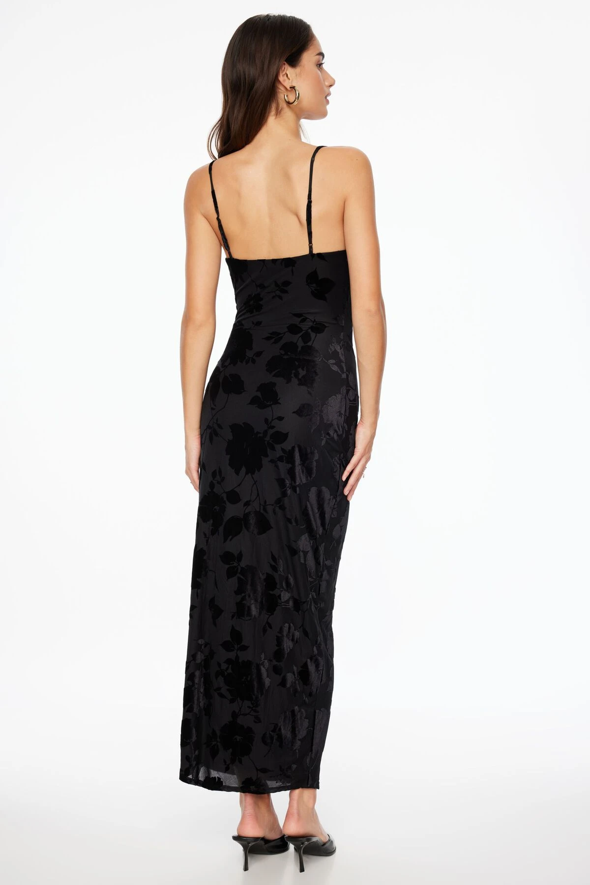 Dress to the nine’s with this cowl neck midi dress – Designed with a floral flocked patten and stretch fabric for an effortless look.