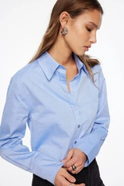 This is a cotton chambray shirt – Designed to be cropped with a relaxed fit for an effortless look.