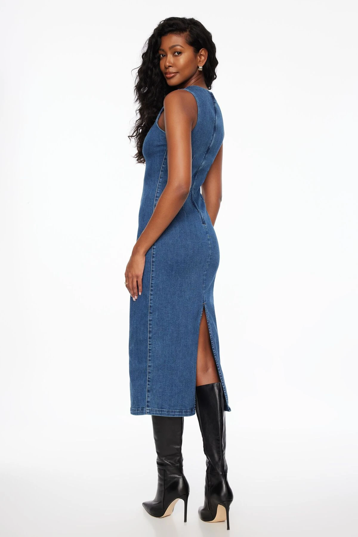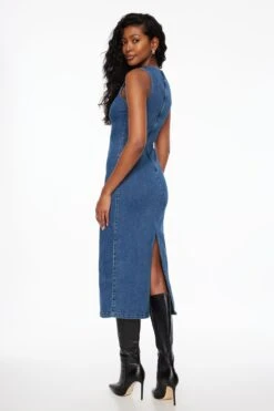Delve into denim with this crewneck denim dress – Designed to be fitted with a stretch for ultimate comfort.