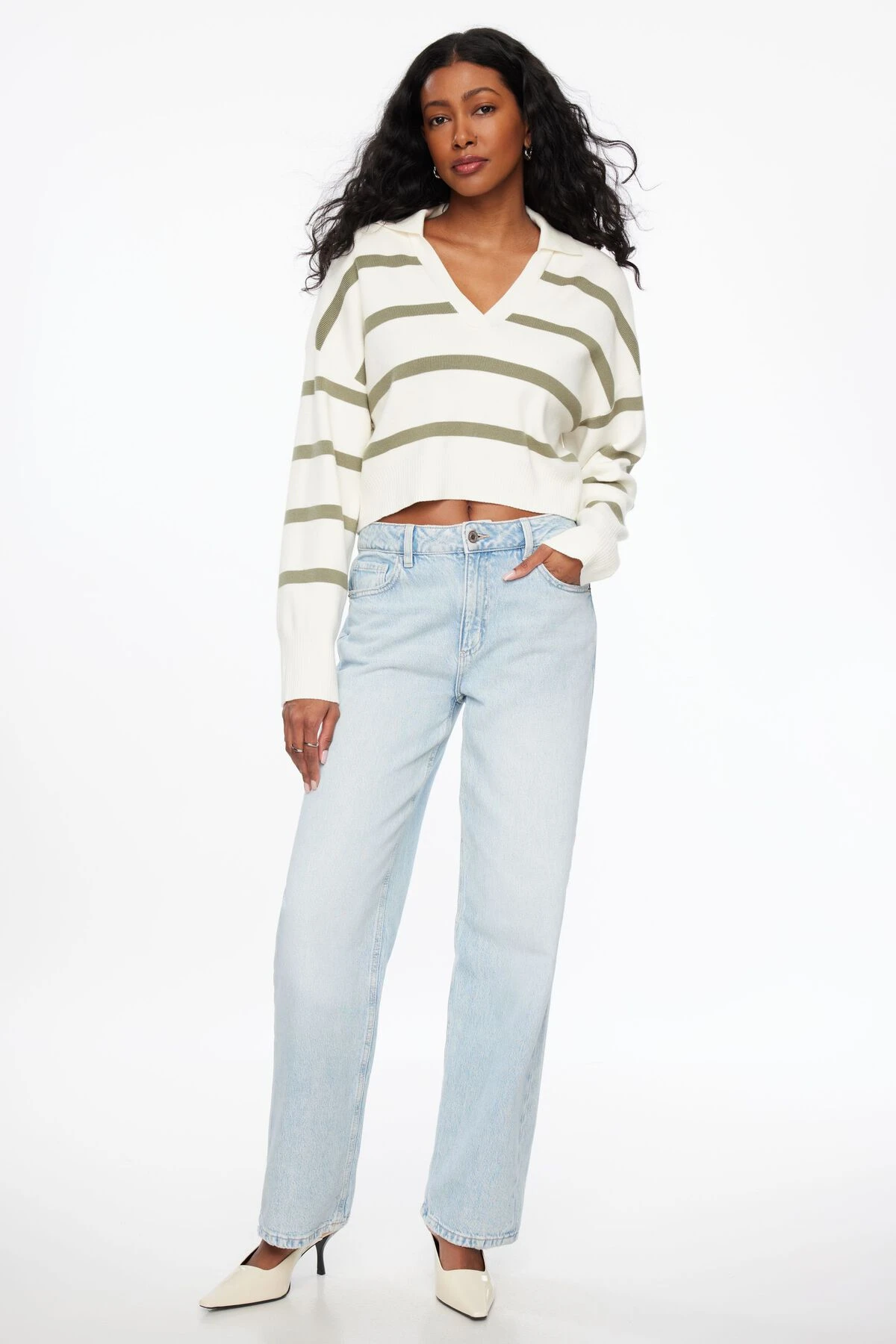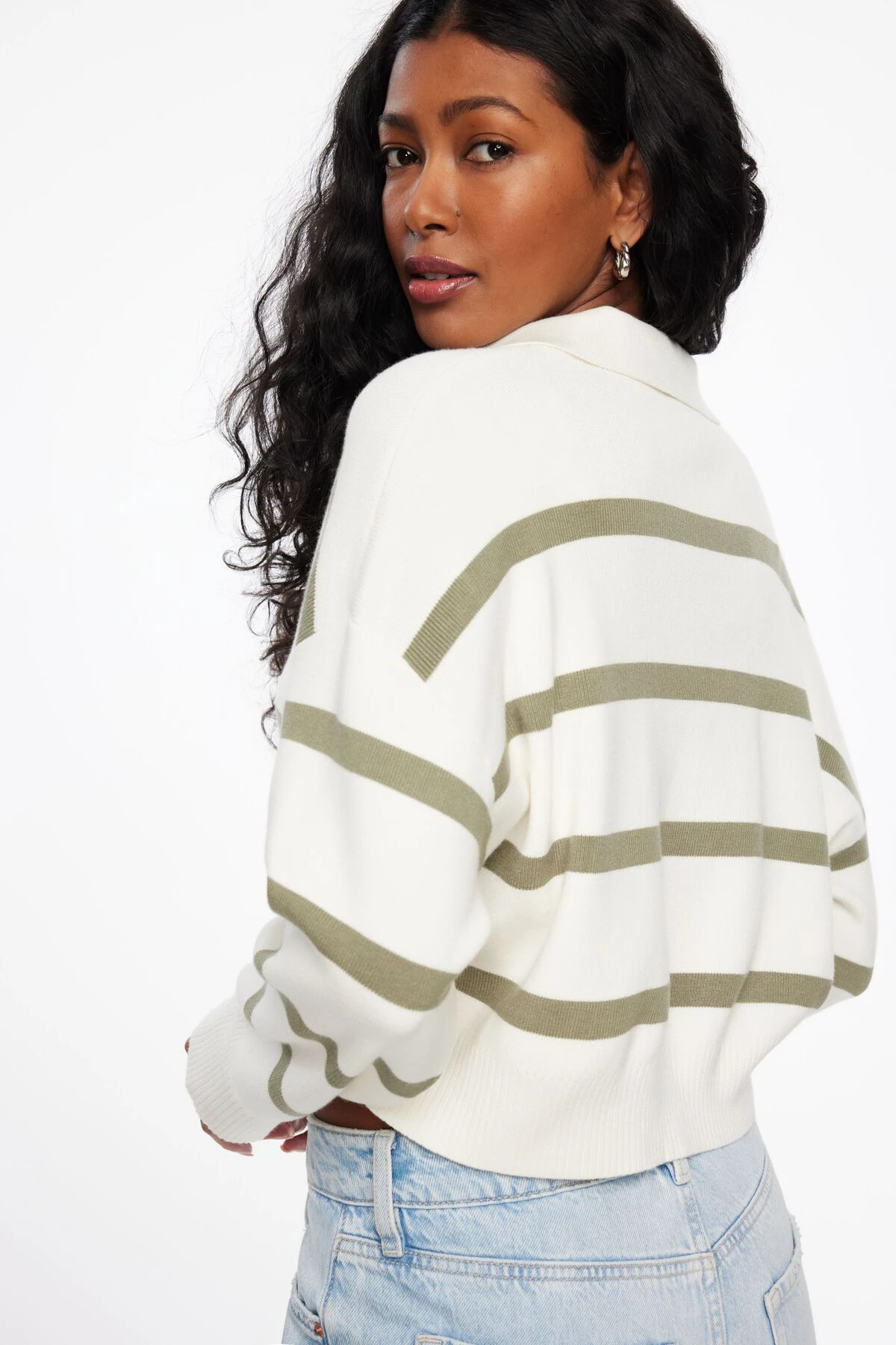 Snuggle into this V-neck cropped polo- Designed with a soft stretch rib-knit fabric