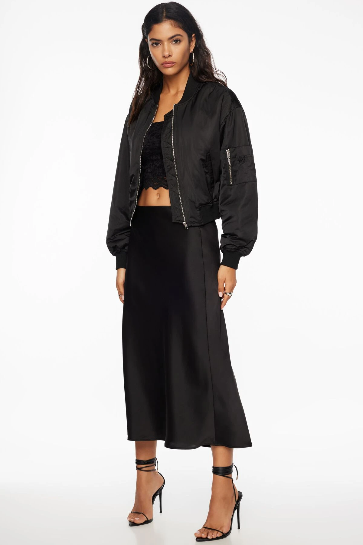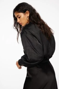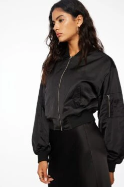 This is a cropped satin bomber jacket – Designed with lightweight recycled materials.
