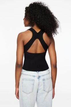 This is a V-neck sweater top made with an open back detail.