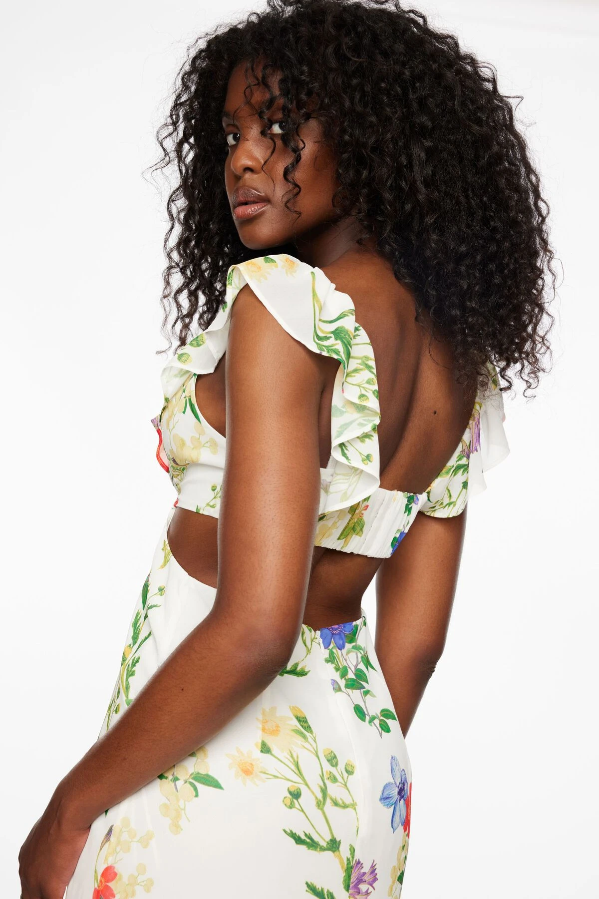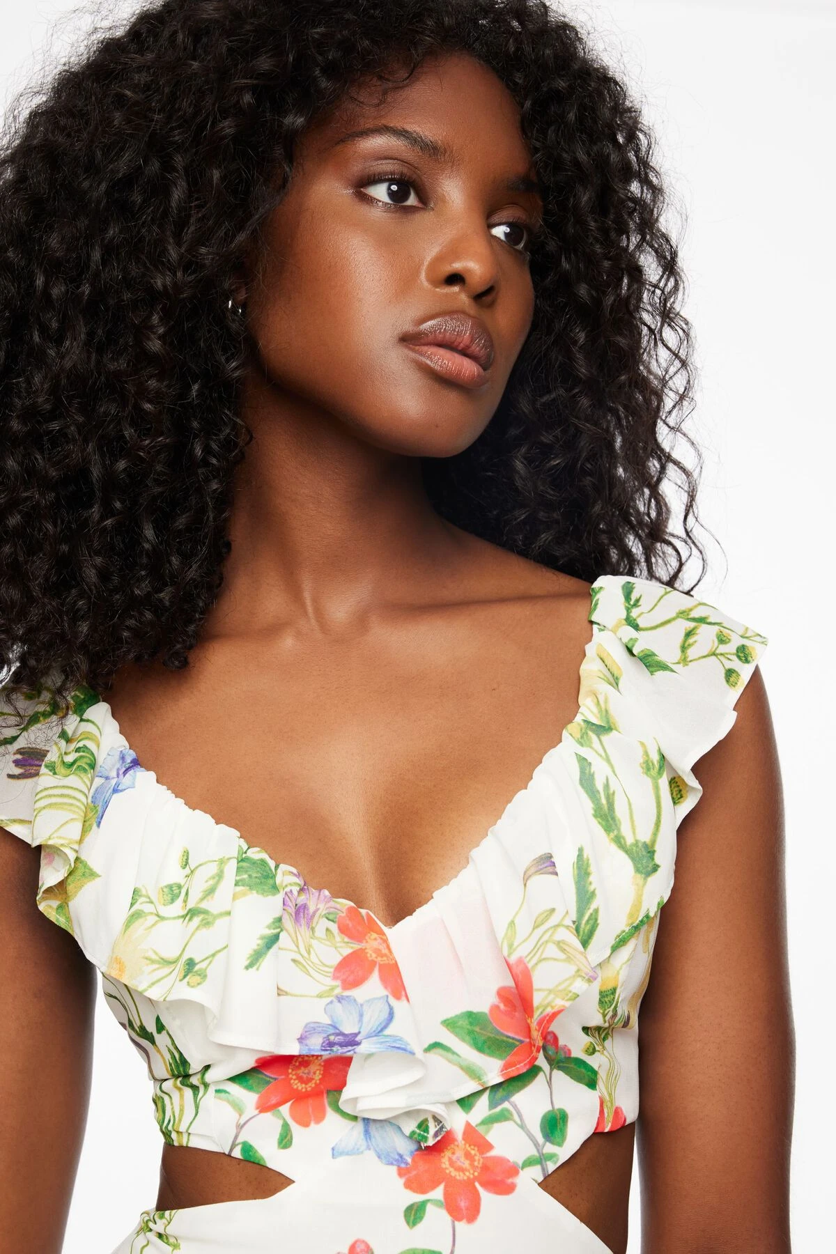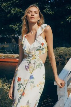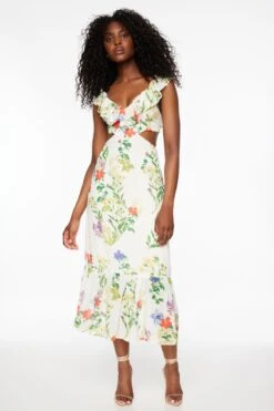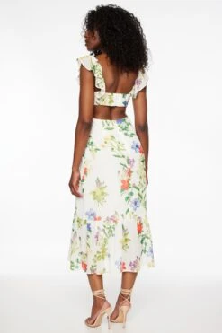 This is a flowy cut out midi dress with ruffles – Designed with a floral print.