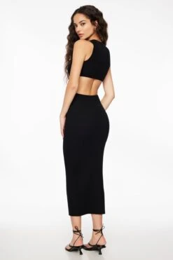 This is a midi sweater dress with a cut out detail – Designed with a lightweight yarn fabric.