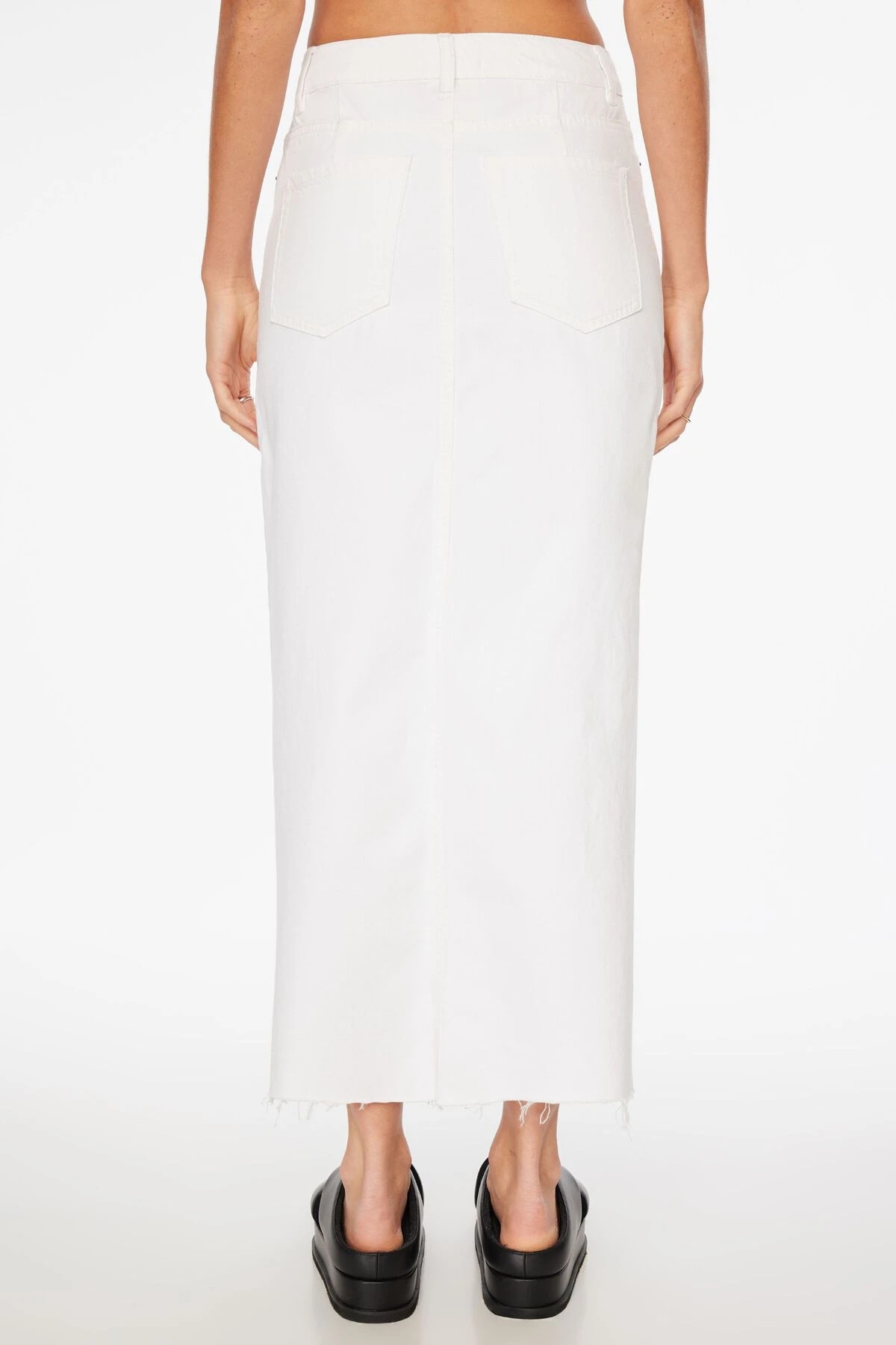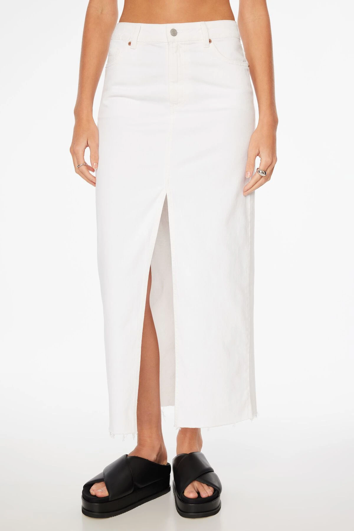 This is a high-rise denim maxi skirt. Made with a front slit.