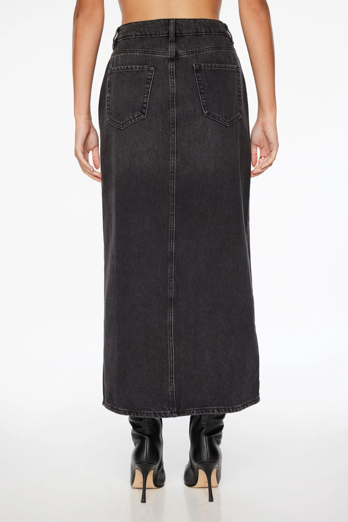 This is a high-rise denim maxi skirt. Made with a front slit.