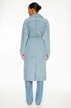 This is a maxi length trench coat – Designed with a lightweight denim fabric.