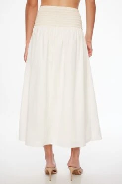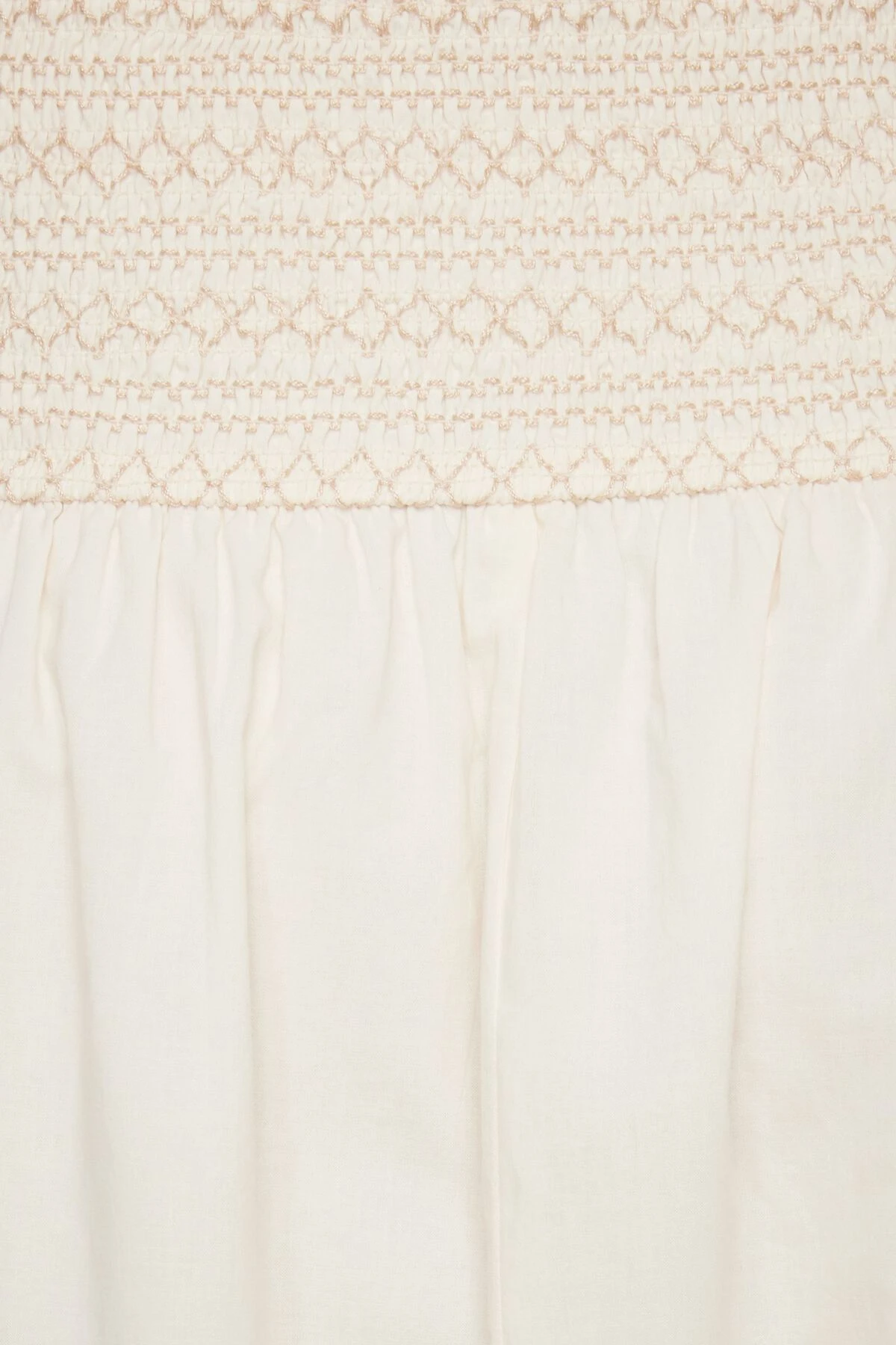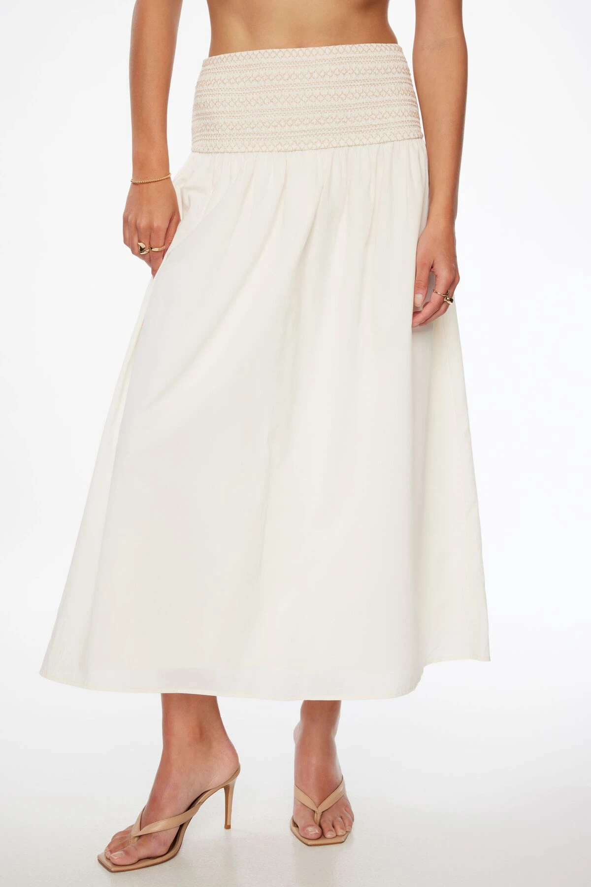This is a cotton voile maxi skirt – Designed with a smocked waist and graphic embroidered detailing throughout.