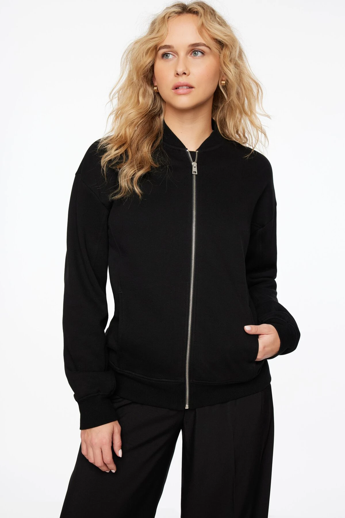 - Rib knit band collar, hem, and cuffs