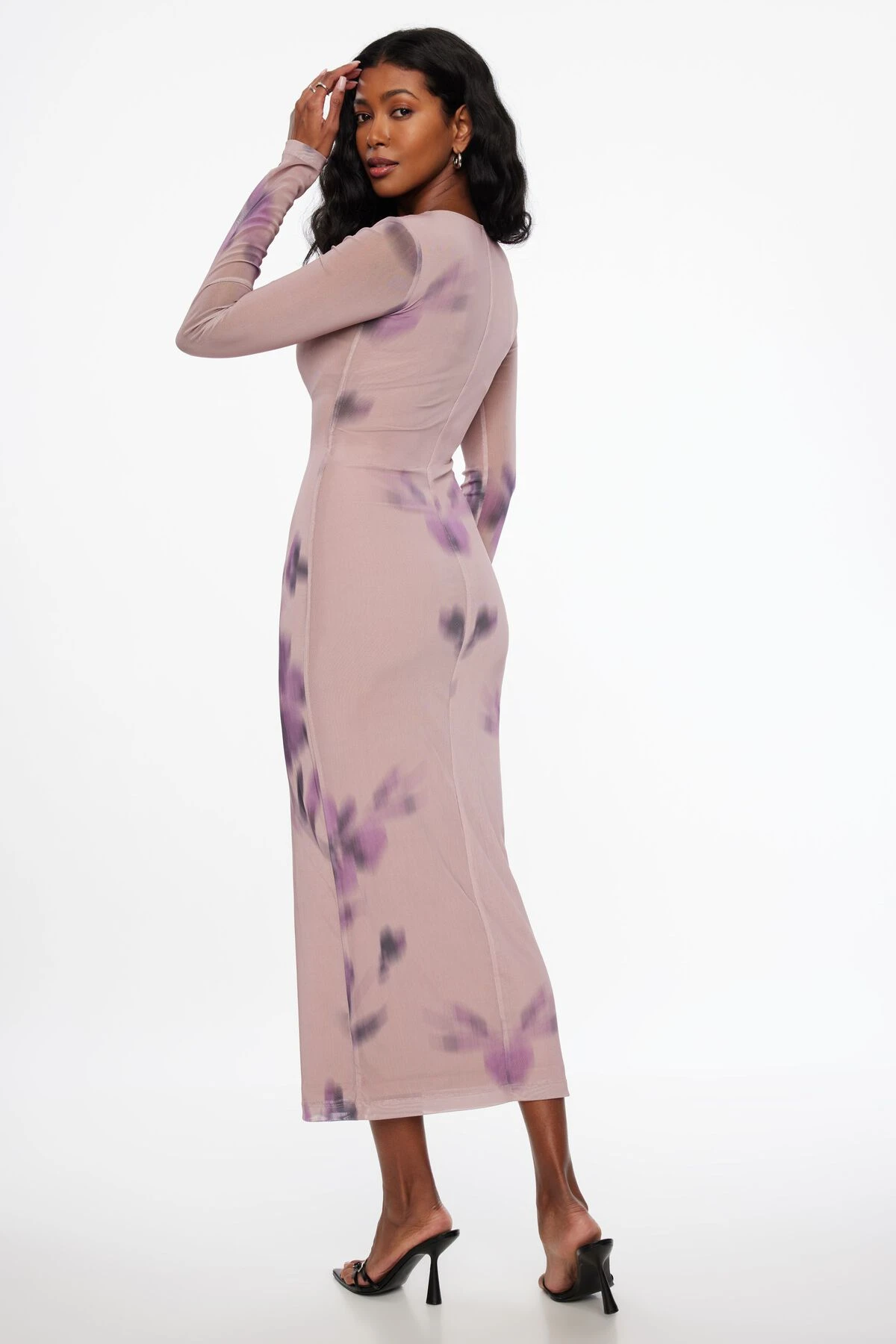 This is a mesh maxi dress – Designed with a floral pattern and to be fitted with a stretch.