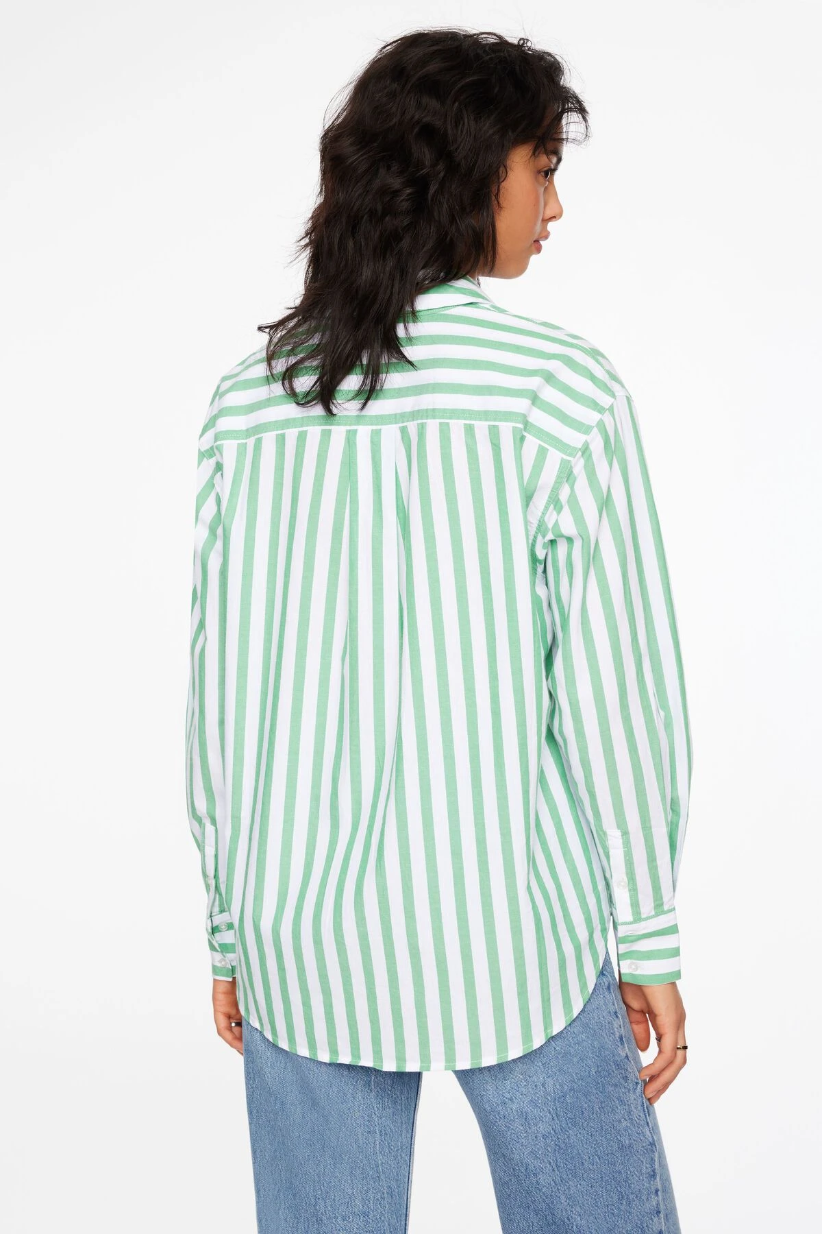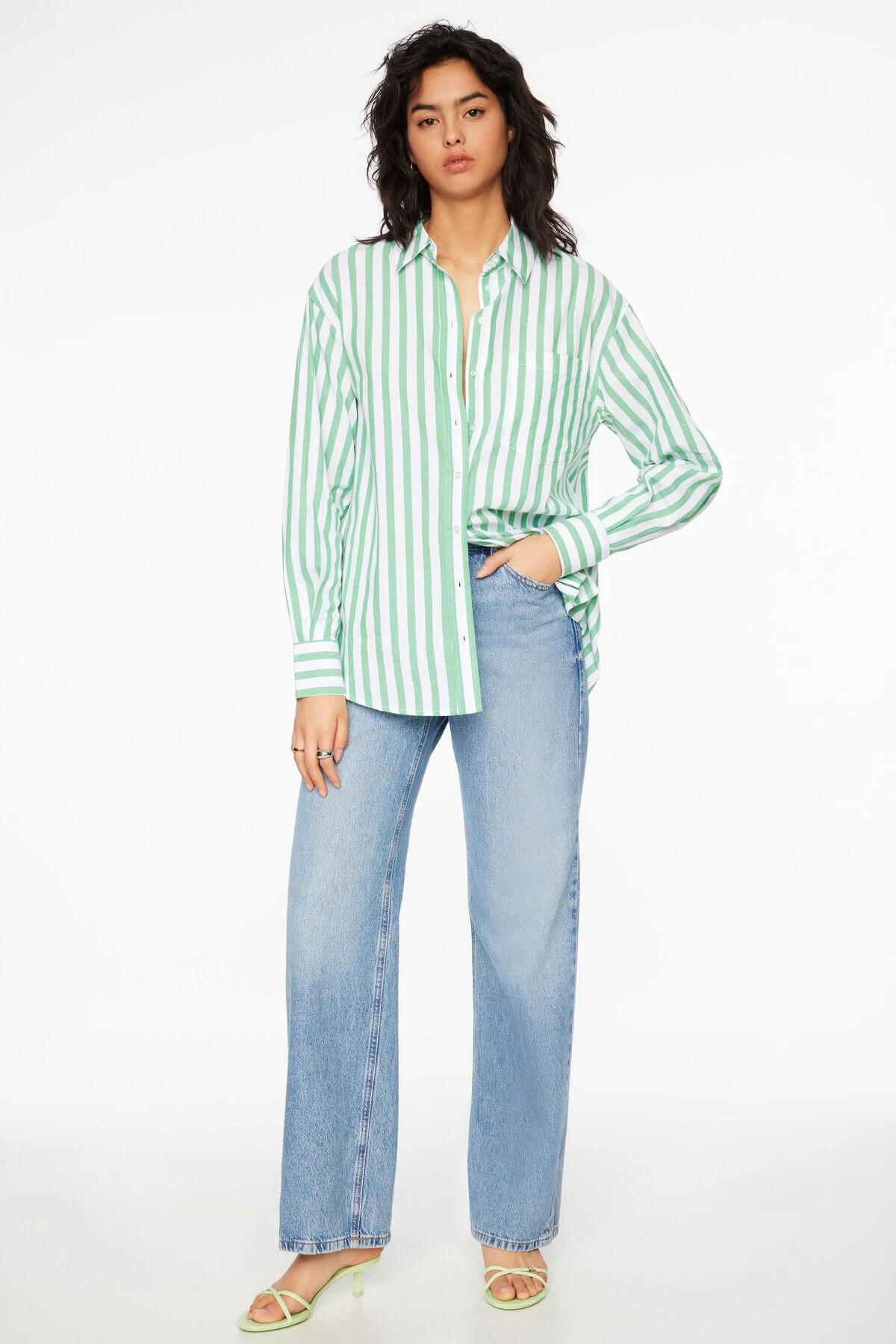 This is a striped button up shirt made in an oversized fit for a casual look.