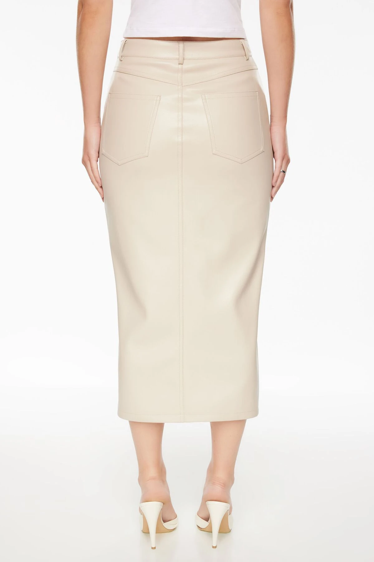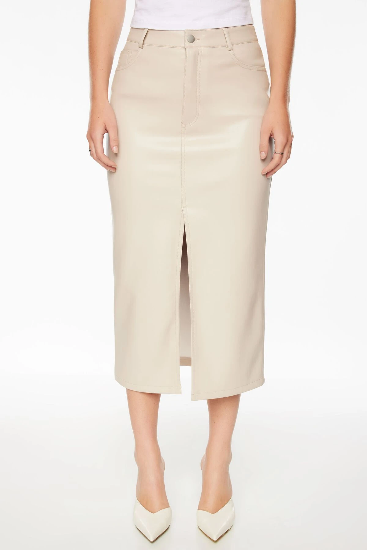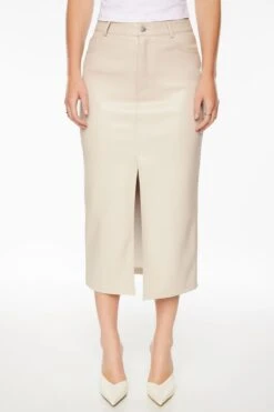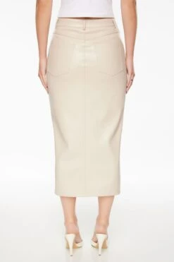 Meet Gigi – A high-rise faux leather midi skirt with a front slit. Made with vegan leather that has a soft and smooth feel.