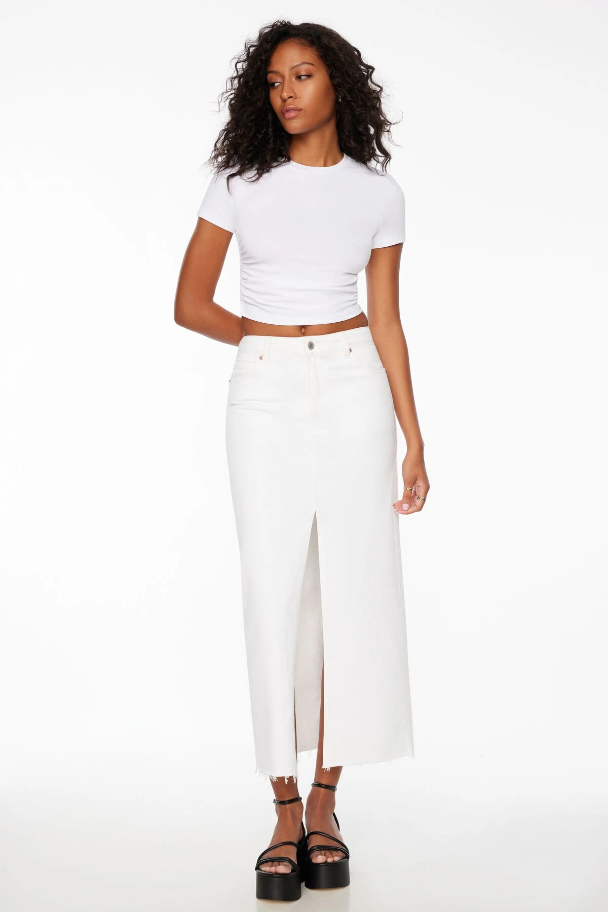 This is a short sleeve crew neck t-shirt with a ruched side detail.