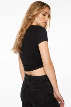 This is a short sleeve crew neck t-shirt with a ruched side detail.