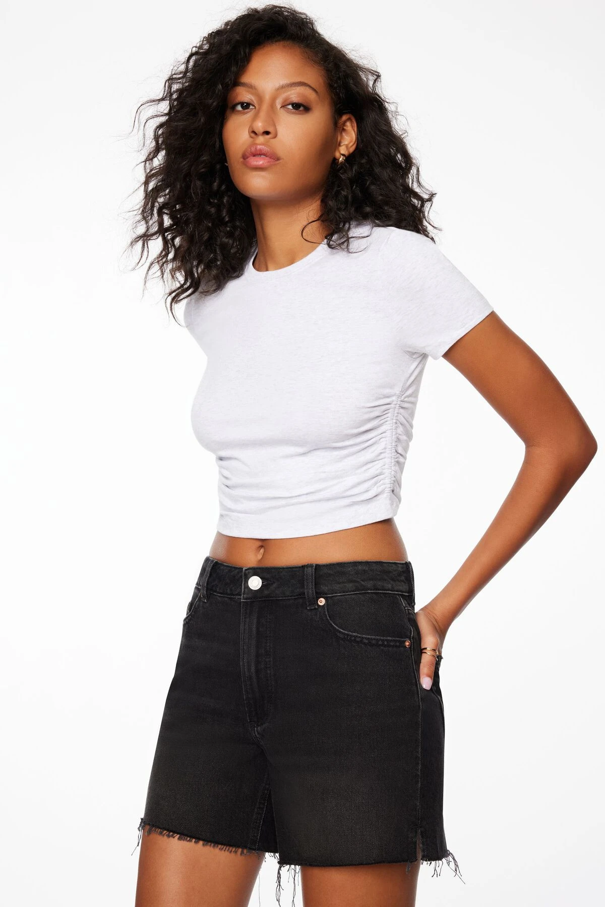 This is a short sleeve crew neck t-shirt with a ruched side detail.