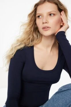 Dynamite Harlynn Long Sleeve Jersey Scoop Neck Top In Navy Blazer