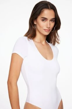 Soft to the touch with the right amount of stretch. This is a short-sleeved jersey bodysuit.