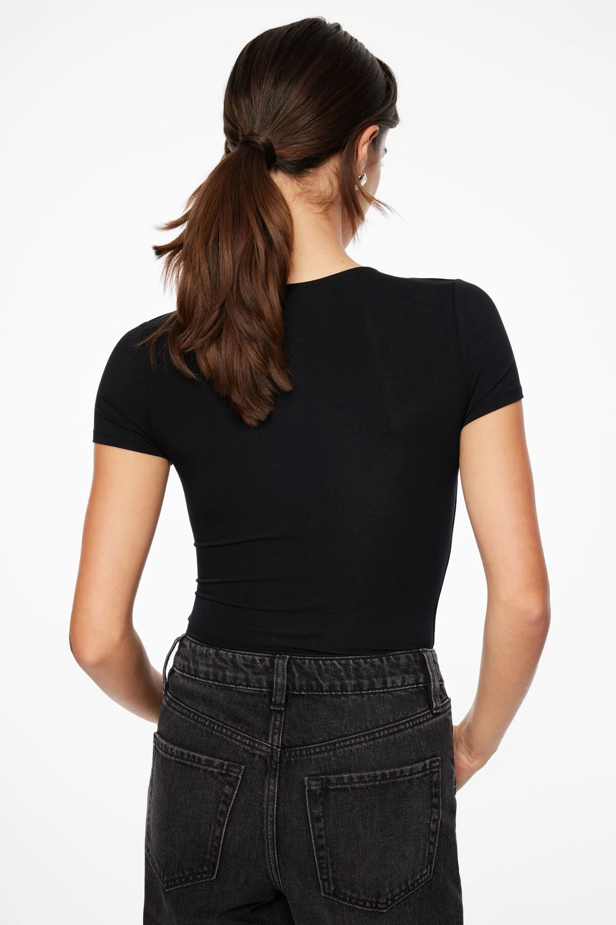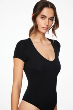 Soft to the touch with the right amount of stretch. This is a short-sleeved jersey bodysuit.