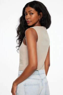 Elevate any look with this square neck twill vest. Designed to be fitted with a stretch to accentuate your form.