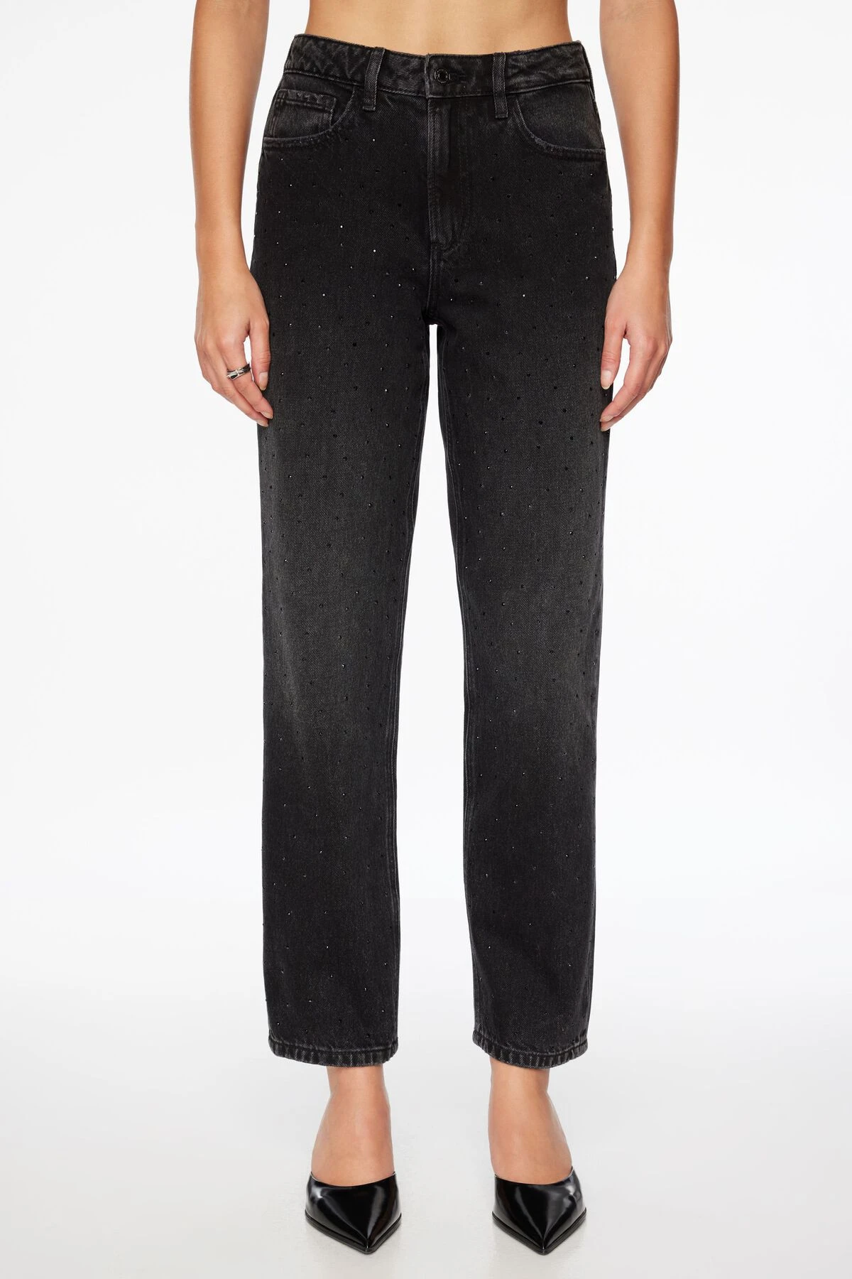 Meet Justina -The ultra high-waisted straight-leg denim jeans – embellished with rhinestones and authentic denim that hugs your form.