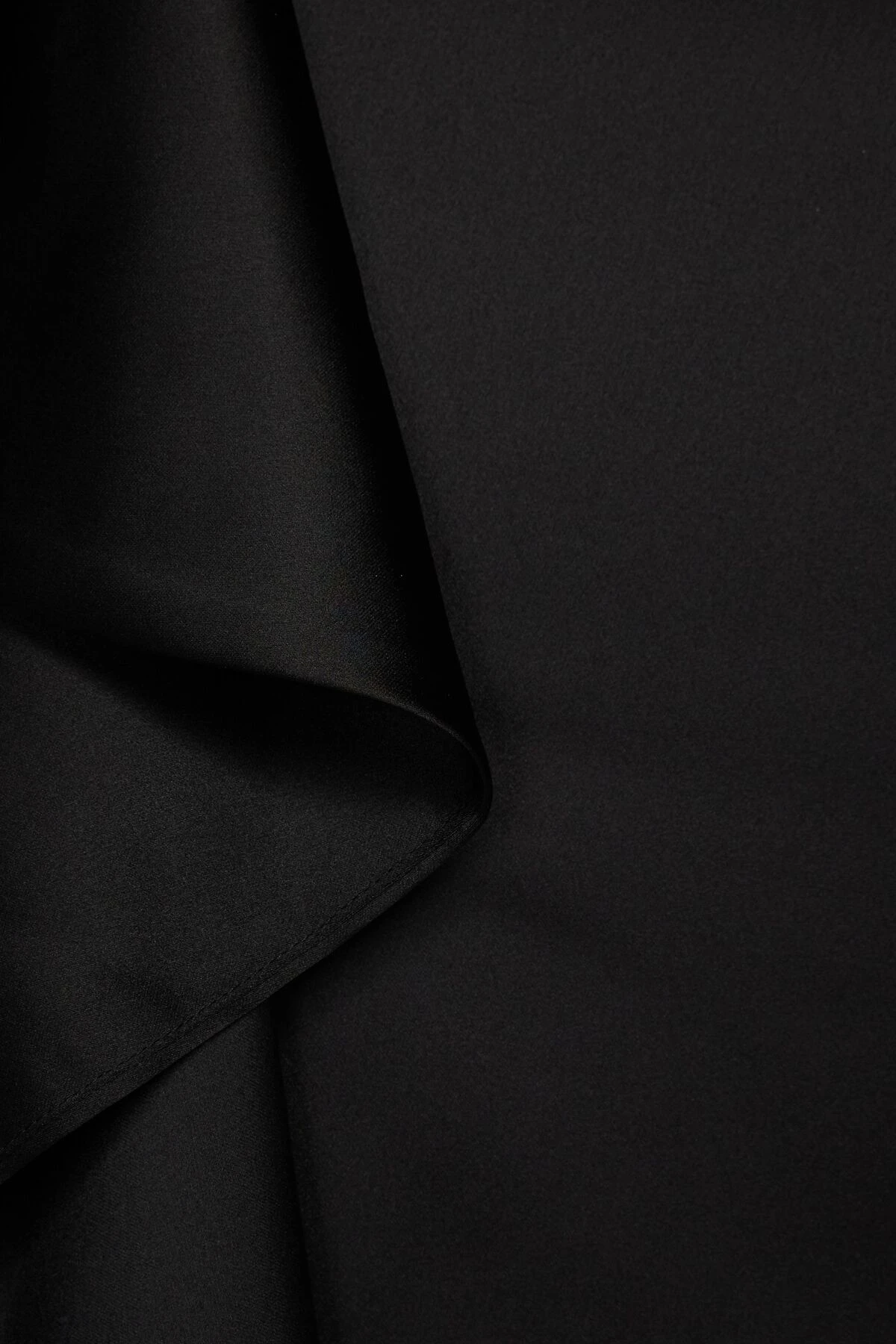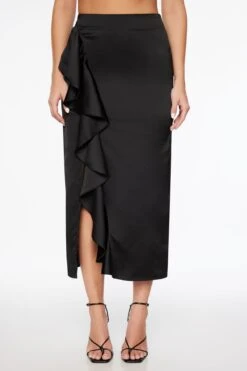 This is a satin maxi skirt – Designed with a ruffled trim and vent with a lustrous touch.