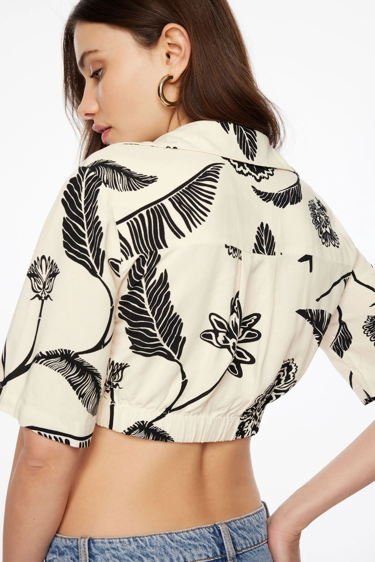 Soft to the touch, this is a pattern printed linen twisted blouse – Designed with lightweight fabric and dropped shoulders.