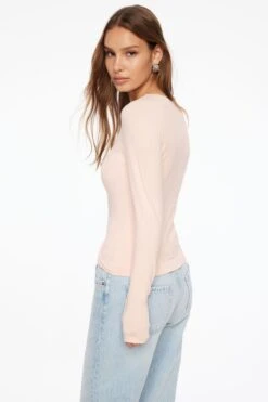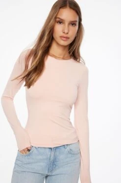 Fitted to your form, this is a long-sleeved crewneck jersey top – Designed with a stretch to accentuate your figure.