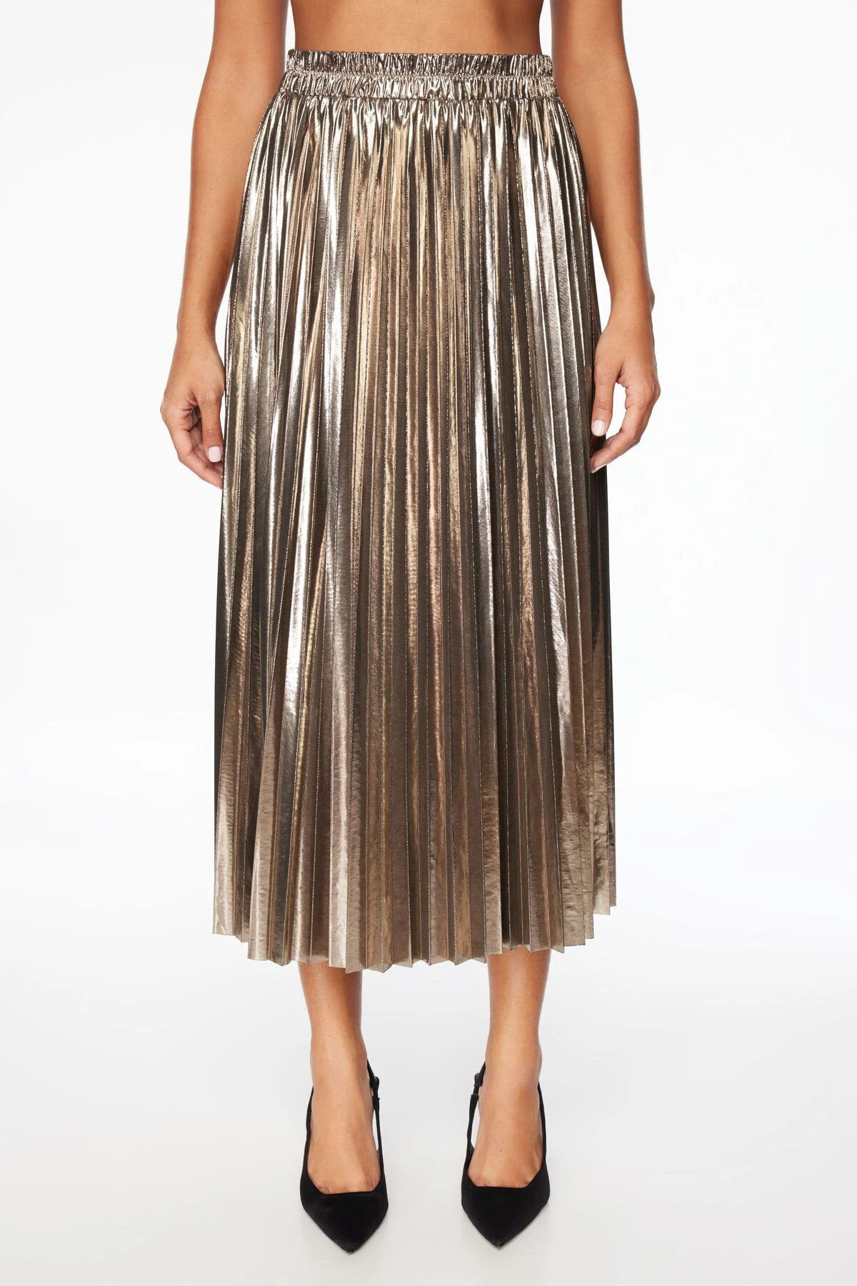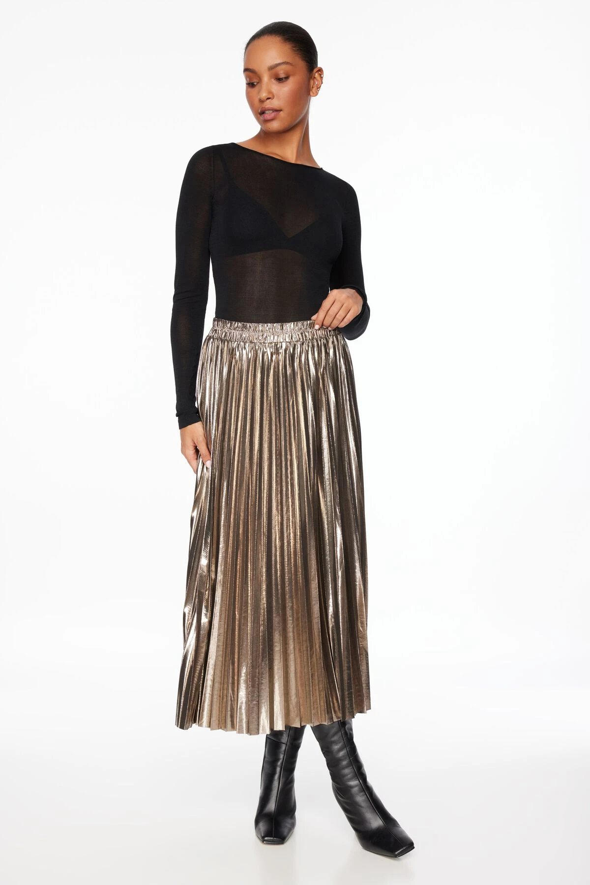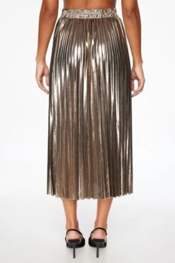 Shine bright with this metallic pleated midi skirt – Designed with an A-line construction and elasticized waistband for ultimate comfort.