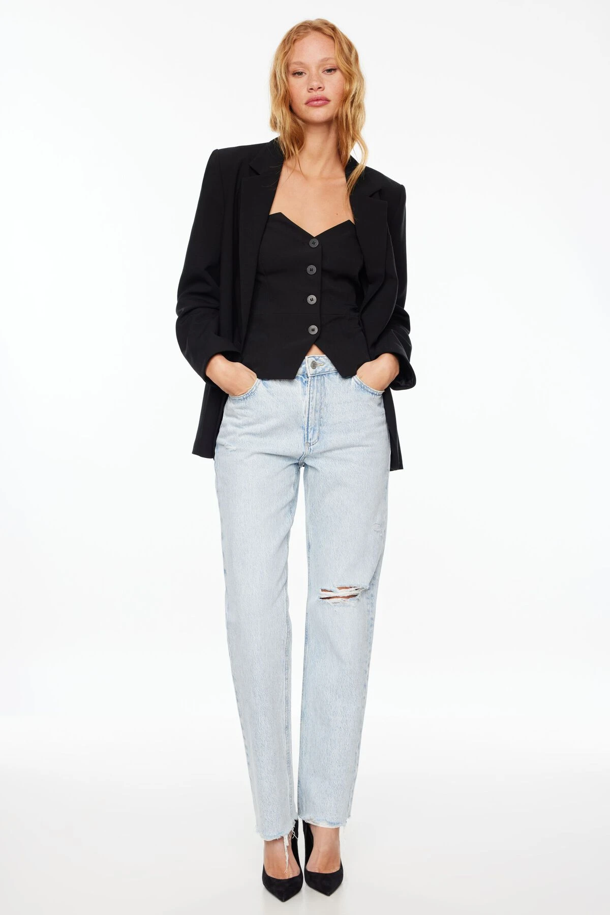 This is a tailored button bustier top to create the perfect chic look.