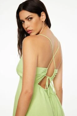 This is a linen blend deep v-neckline mini dress with a strappy open back detail.