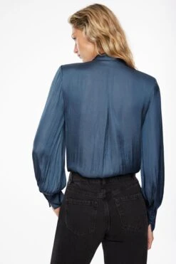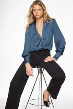 This is a draped bodysuit – Designed with a lustrous satin fabric.