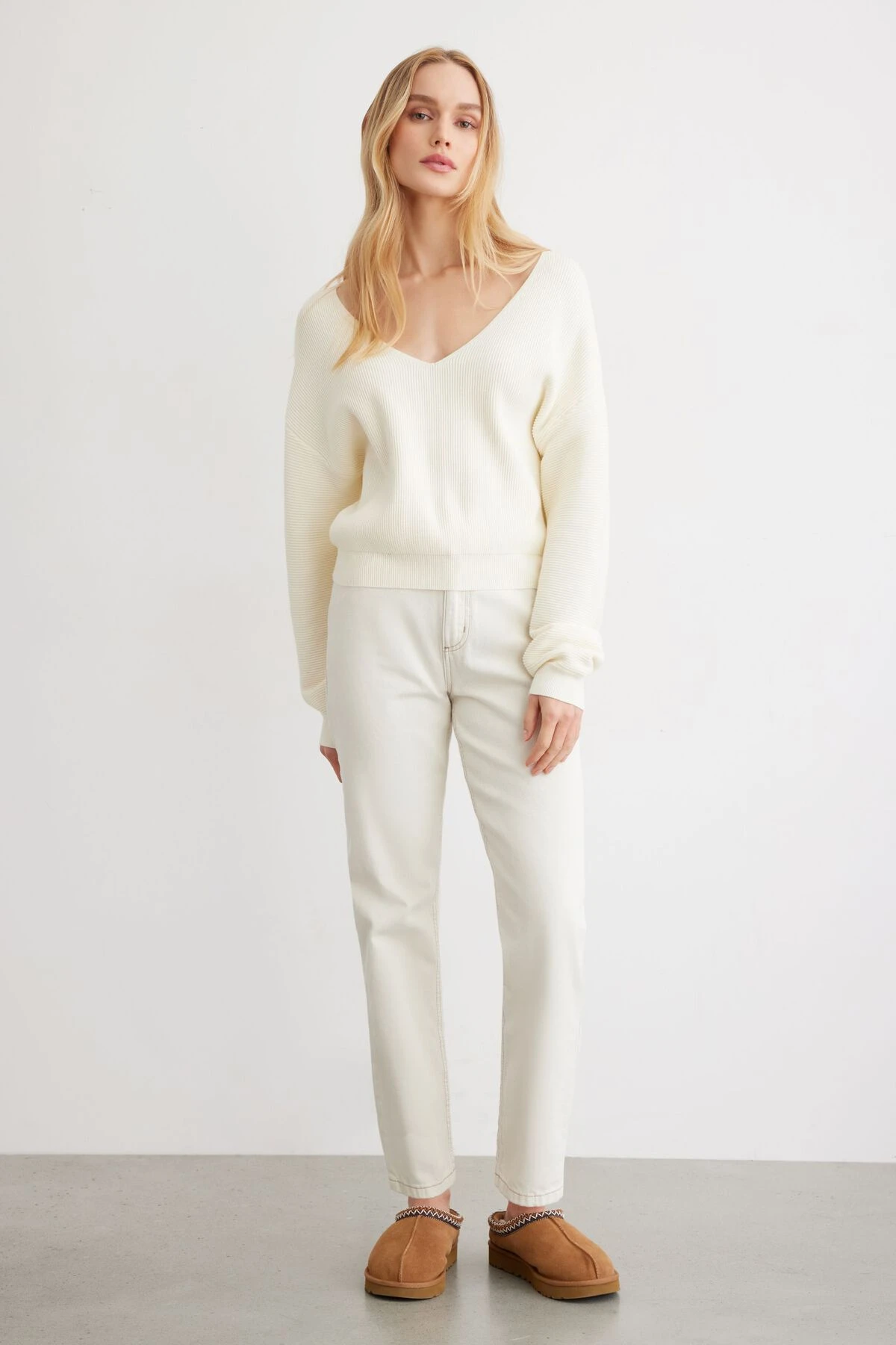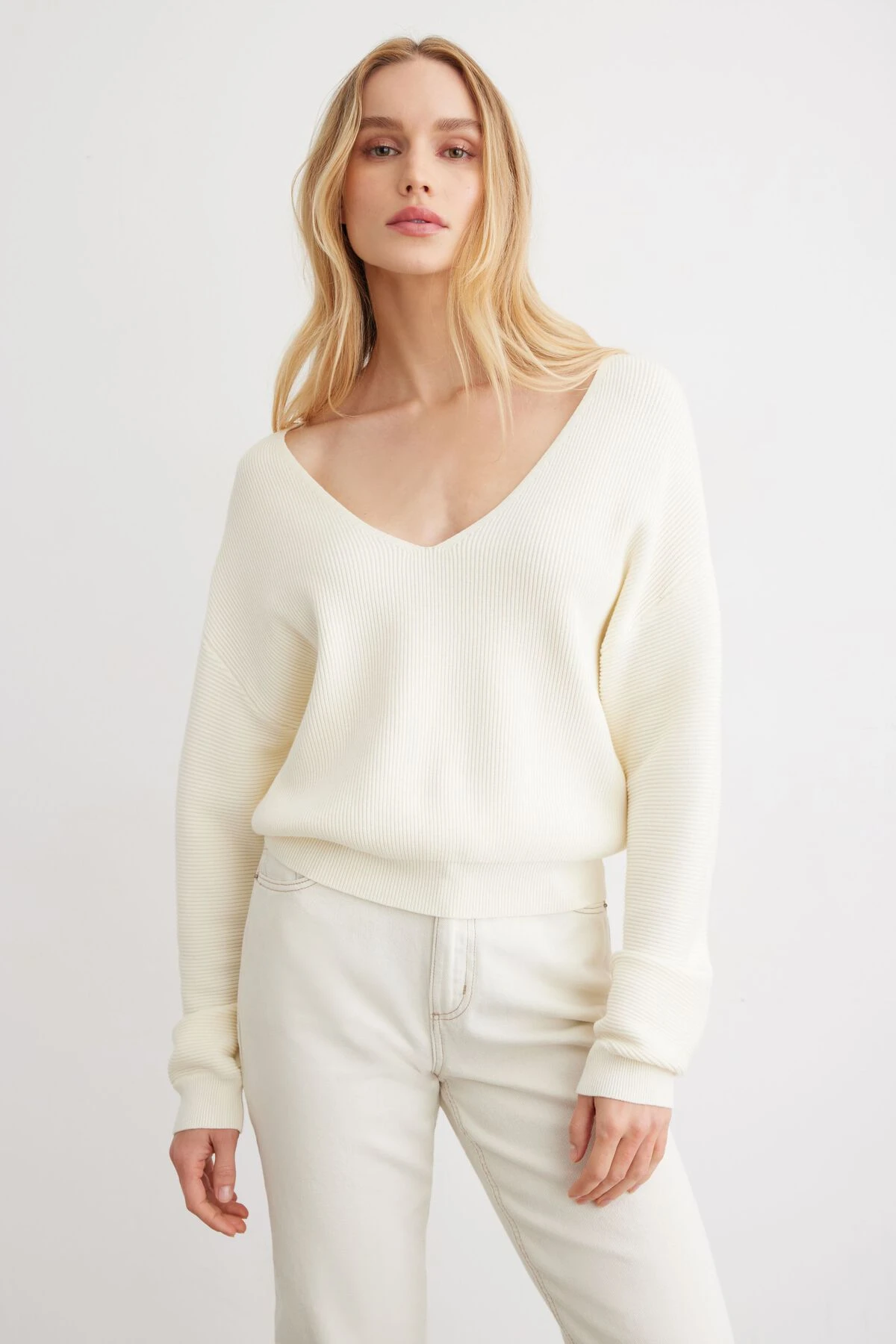 - Deep v-neck
