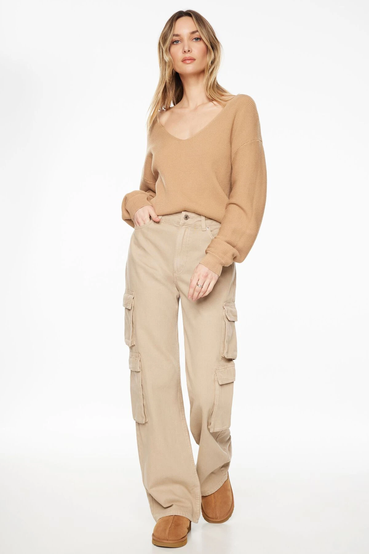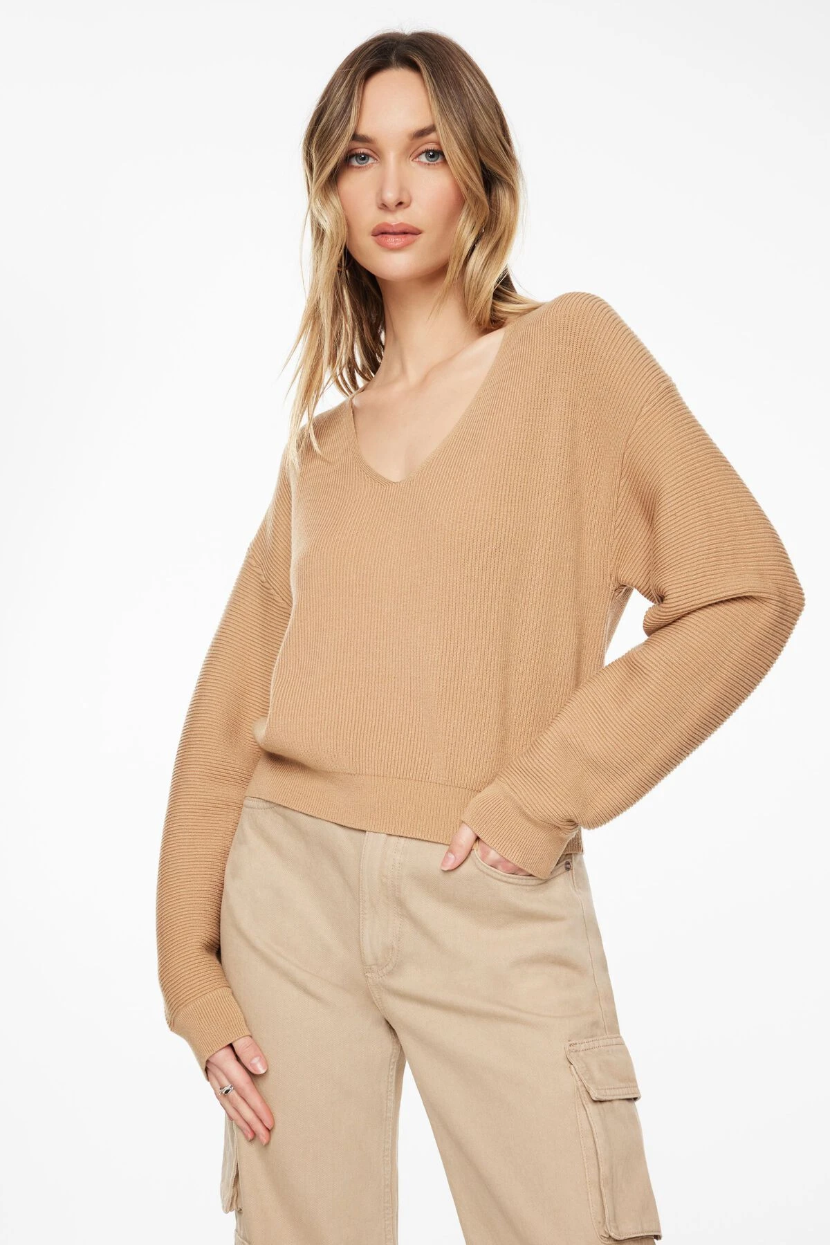 - Deep v-neck