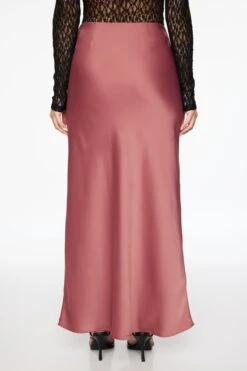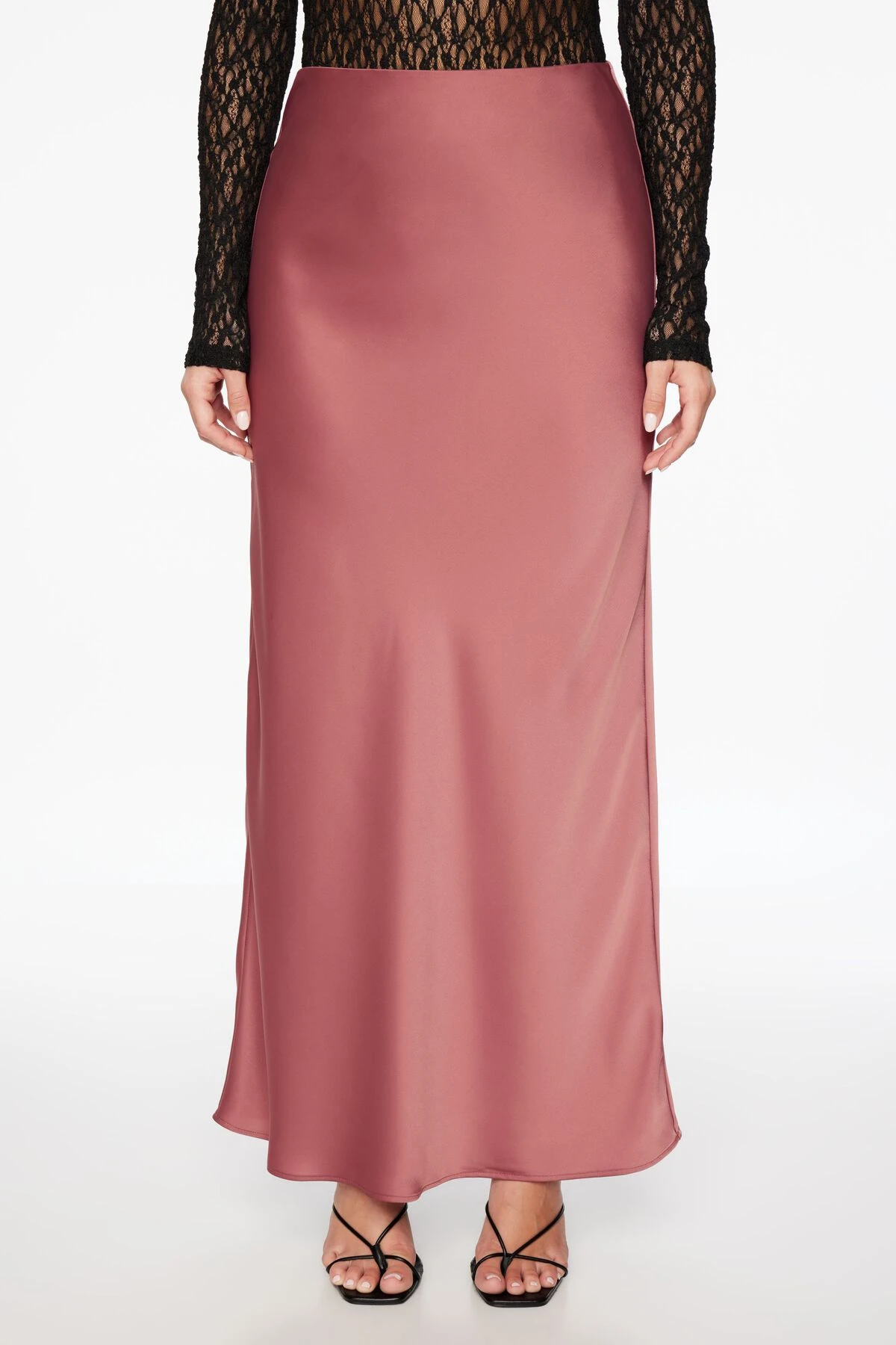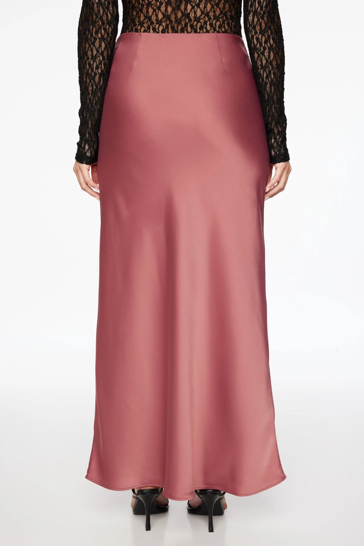 This is a satin slip maxi skirt with a flowy skirt and a lustrous touch.