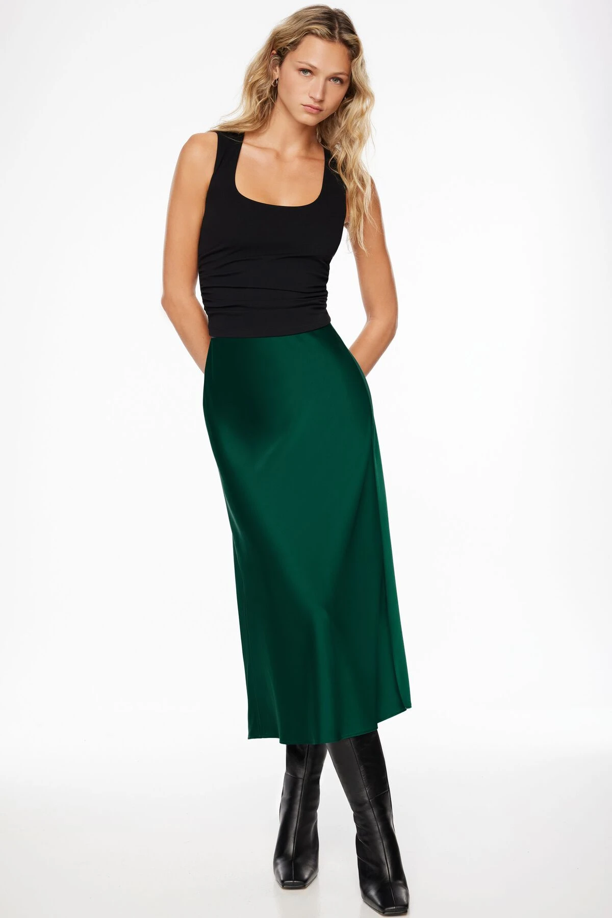 Let me introduce you to Melody – She is a satin slip midi skirt with a flowy skirt and a lustrous touch.