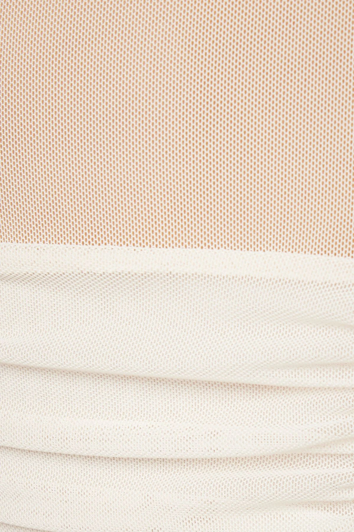 This is a mesh bustier top – It is designed with a semi-sheer detail and a stretch ruched fabric.