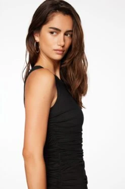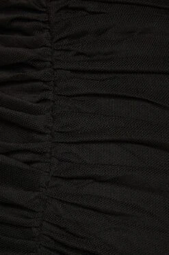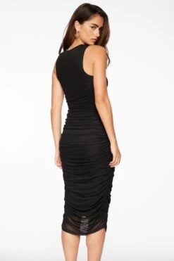 This is a ruched midi dress -Designed with a lightweight mesh fabric.