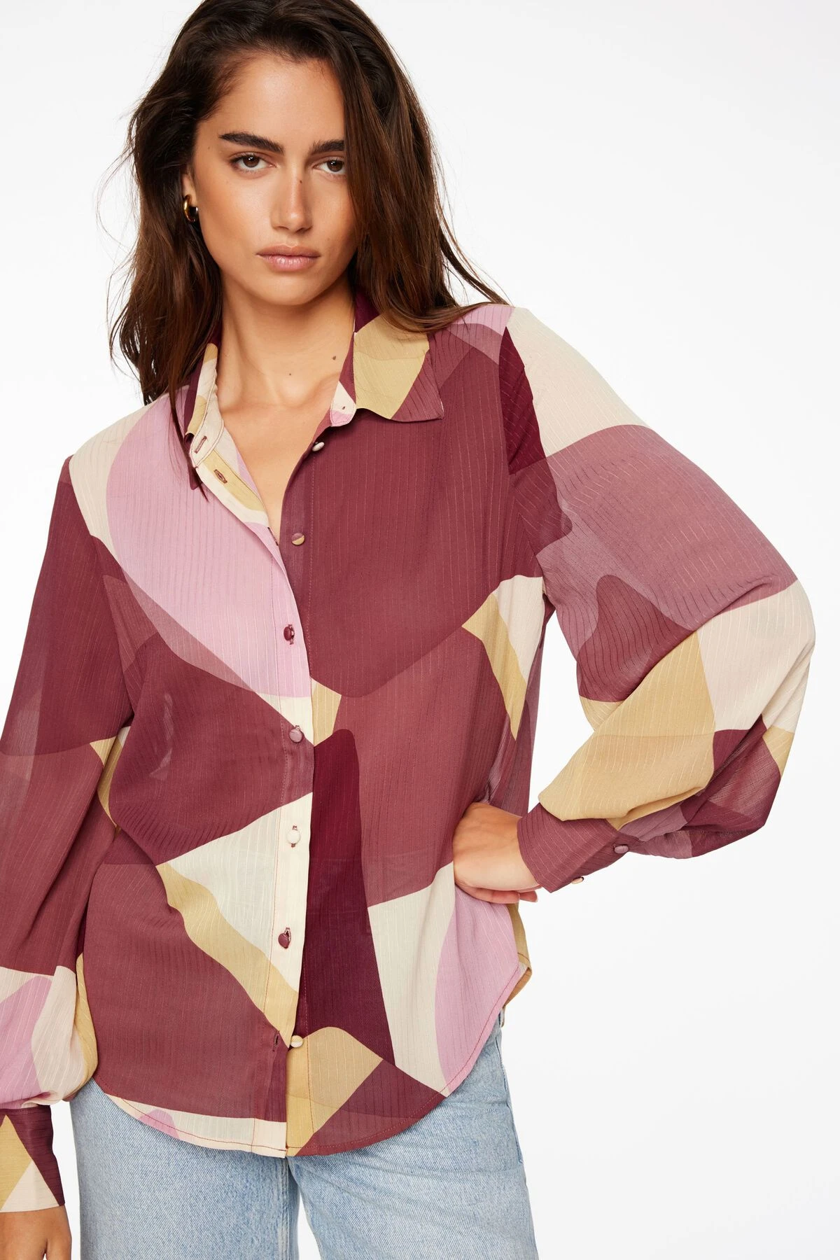 This is a button up shirt – Designed with a sheer fabric and abstract print.