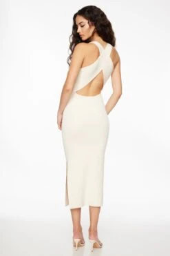 This is a body-contouring soft sweater dress with a slit and the perfect amount of stretch and comfort.