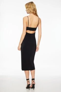 This is a body contouring pleated midi dress with an open back detail.