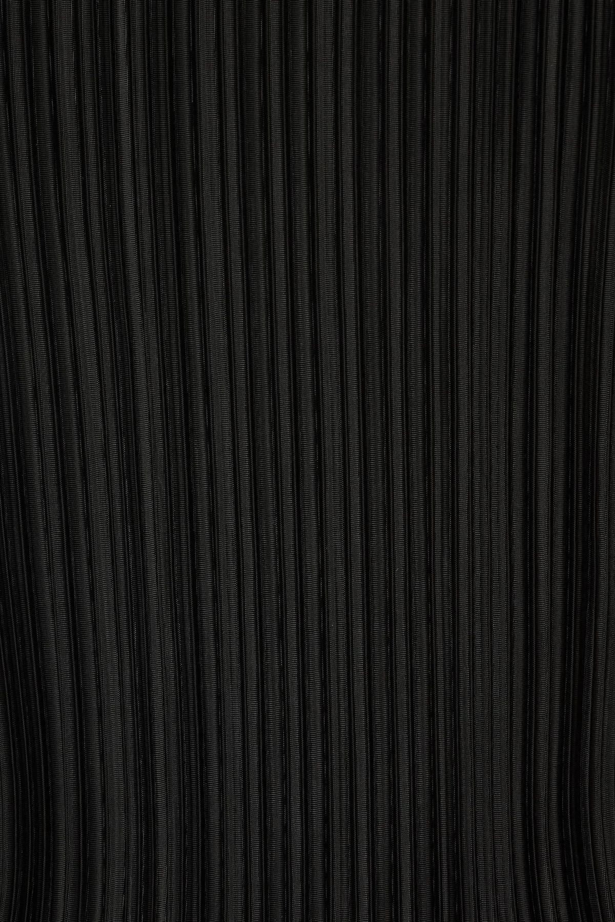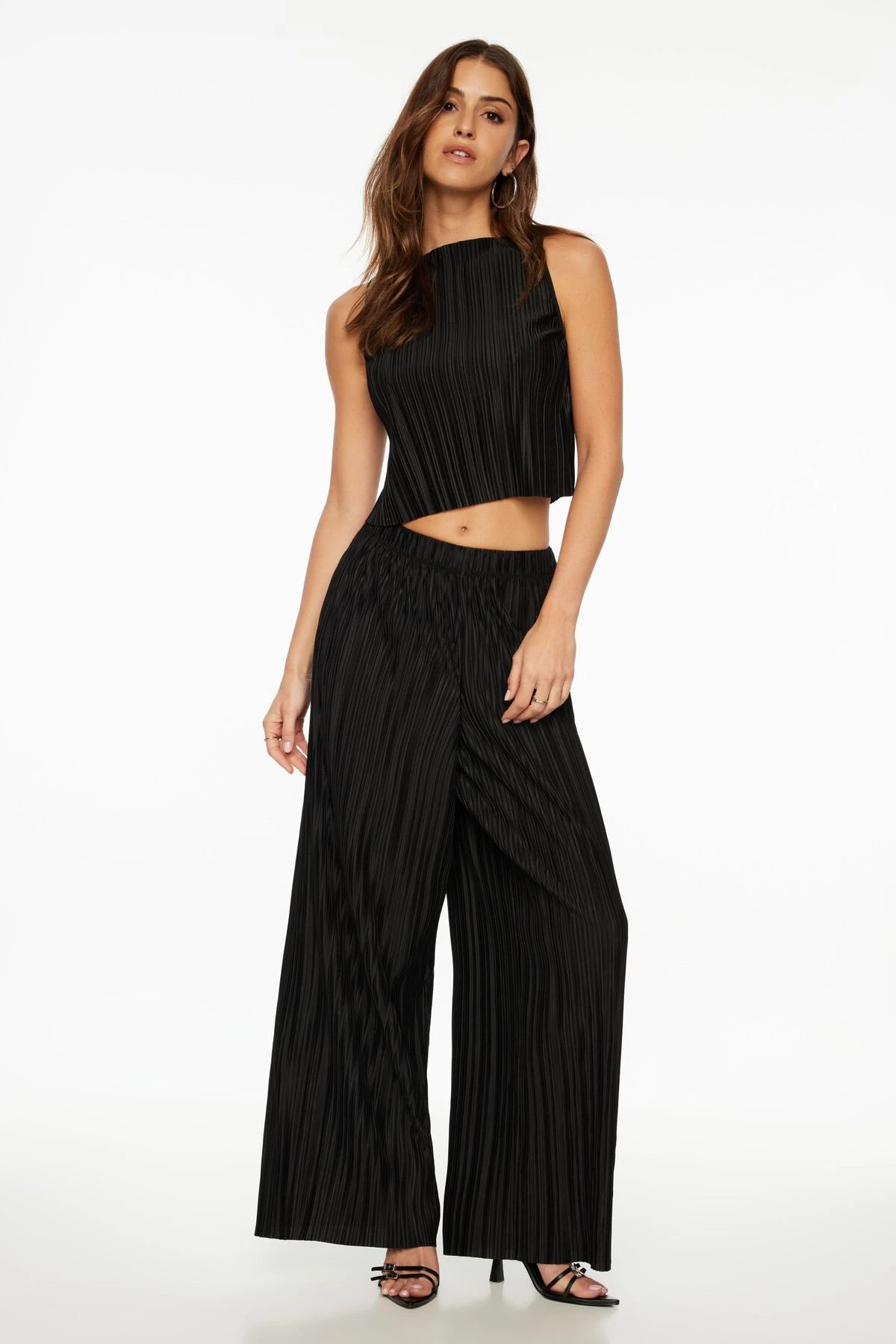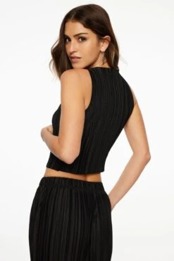 This is a sleeveless pleated top – Designed with a textured stretch fabric.