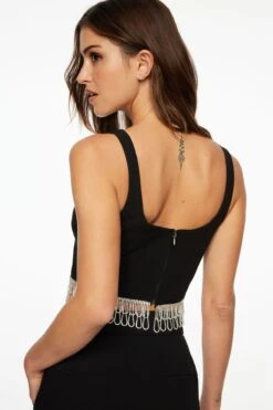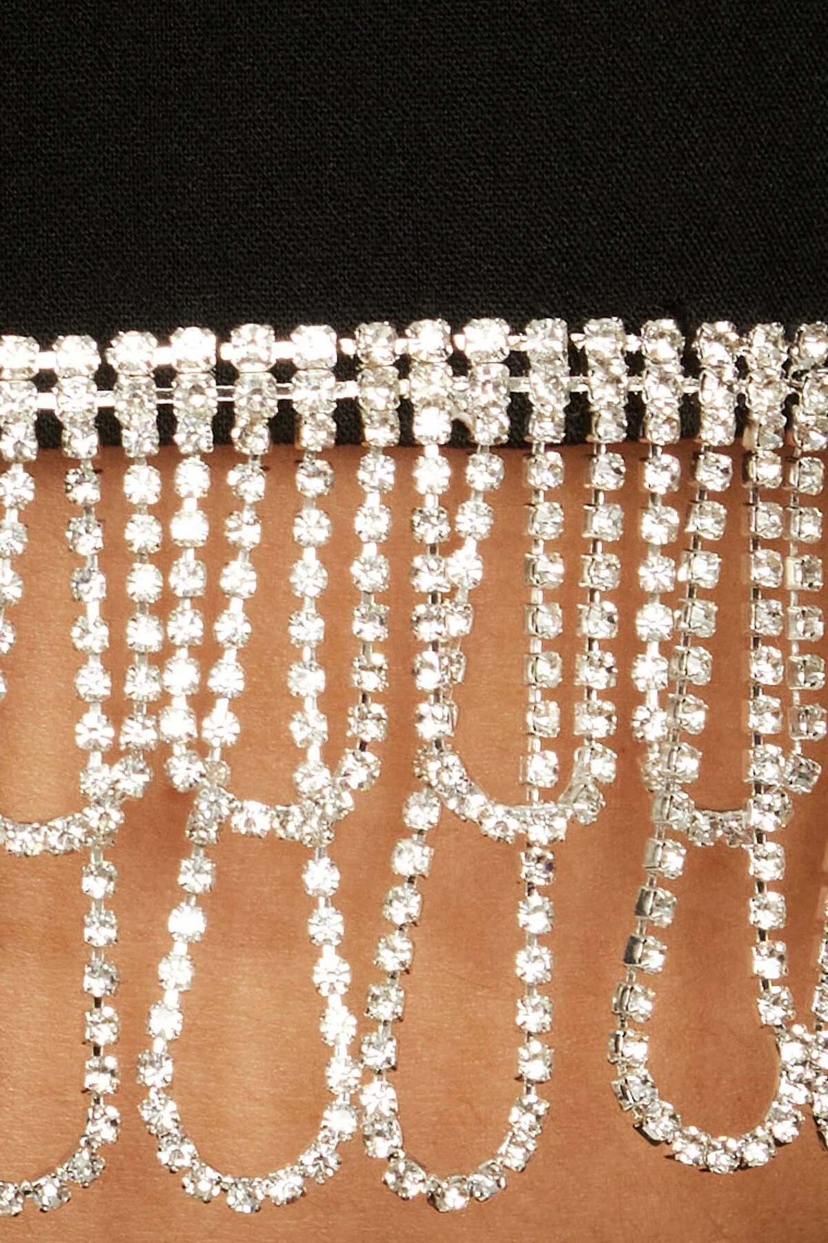 Make a statement with this grain de poudre crop top – Designed to be fitted with a stretch and rhinestone embellished fringe detailing.